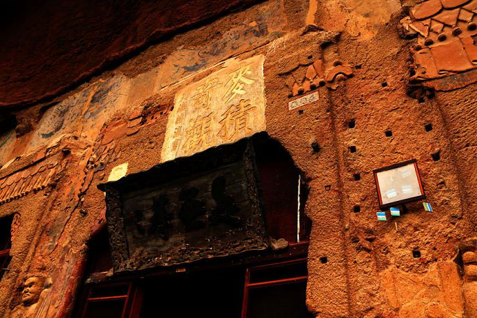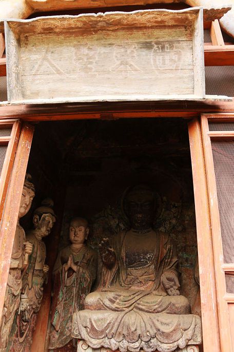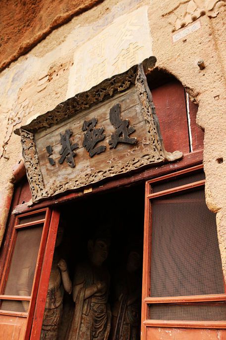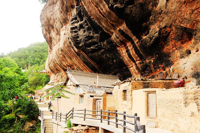 我们15:12到瑞应寺,即沿着这座没有开放的小寺院后面那凌空穿云、迂曲回环的栈道,登上高高的山崖,由东向西参观起了崖壁上密如蜂巢般的洞窟。