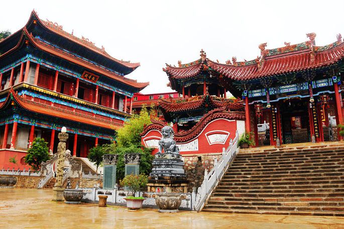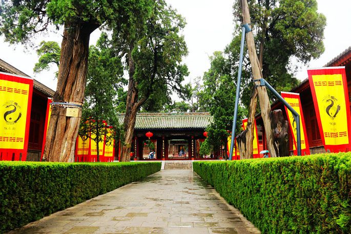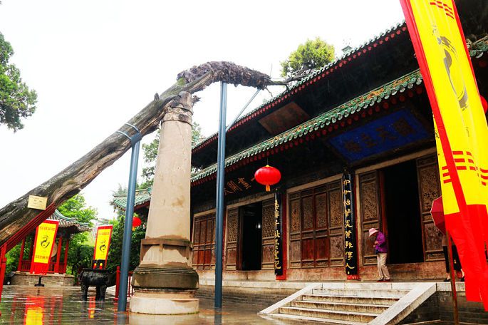 先天殿内现存有明代伏羲泥塑彩绘巨像,身高三米,手托先天八卦盘,威仪古朴,俨然一位古代圣者的形象。另外,殿内天花彩绘河图居中的先天八卦和六十四卦方位图,在国内的古建筑中是从未见到的。