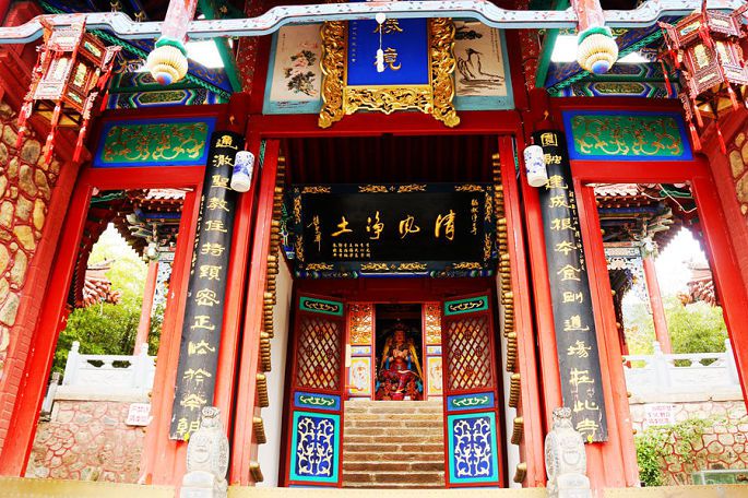 中午时分,我们离开灵应寺,从娘娘殿旁的后山公路往朱家后川方向徒步下山,大约50分钟就来到了与仙人崖相邻的净土寺,也叫曼姝寺,是天水最有名的净土宗寺院。