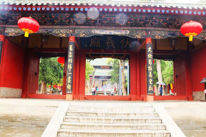 我们从悬有“开天明道”牌匾的大牌楼进入庙内,庭院幽深狭长,我们依序参观,先穿过两旁修剪整齐的树丛夹道,再迈上台阶,通过“伏羲庙”牌匾的大门,抬头望去便是主体建筑先天殿,殿前中门的对联是:“衣冠万国拜神州,桑梓千秋崇圣祀”,横额为“一画开天”。