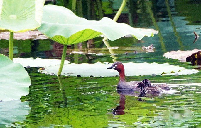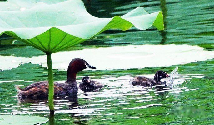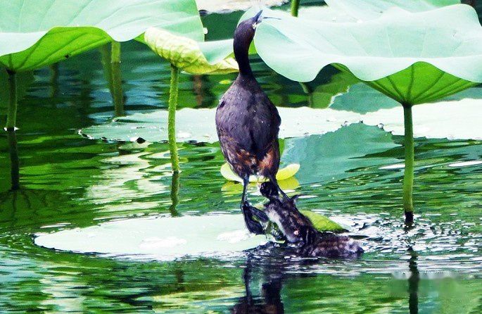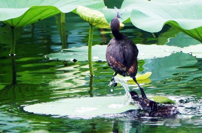 圆明园狮子林一带,常有小鸊鷉出没。我们看到小鸊鷉一家在附近觅食,就跟拍了一阵子。其中最特别的是小鸊鷉吃蜻蜓。通常小鸊鷉是吃小鱼的,这回居然一跃而起叼住了荷花上停的蜻蜓,然后就喂雏鸟了,我记录下全过程,觉得很新鲜。