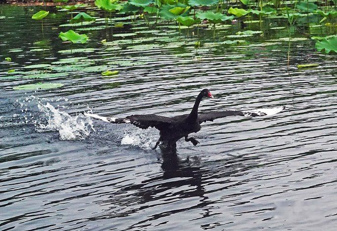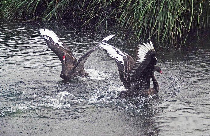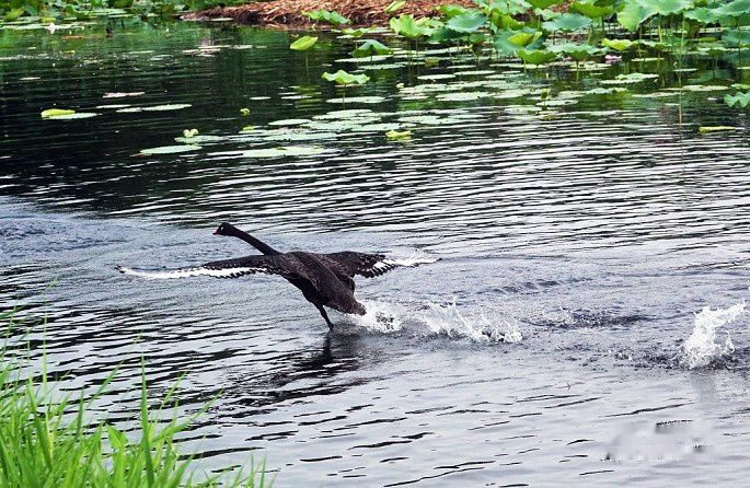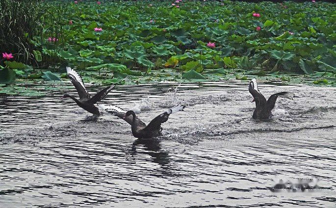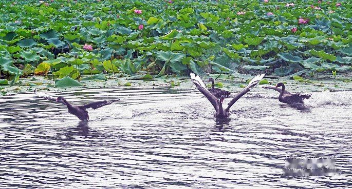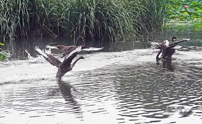 圆明园狮子林,看到有4只黑天鹅亚成鸟,在吃饱早餐后就地戏水,很是热闹。我们跟拍了一阵子,觉得还是蛮漂亮的。