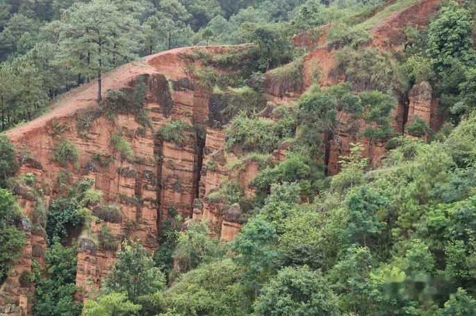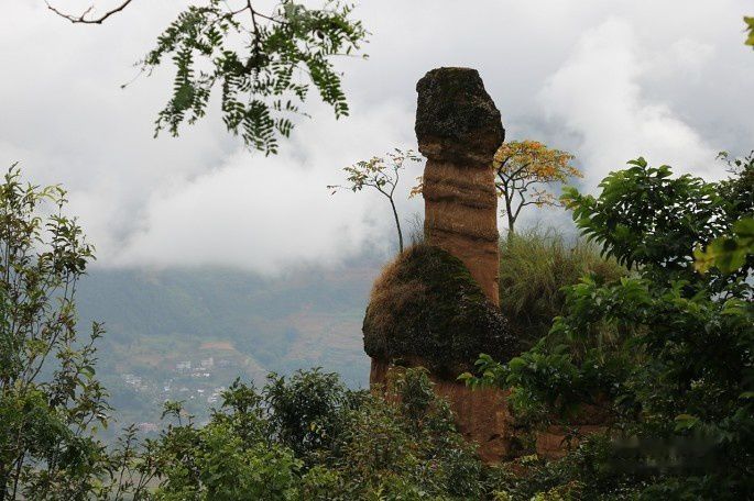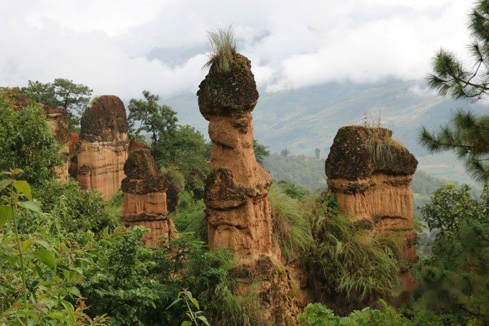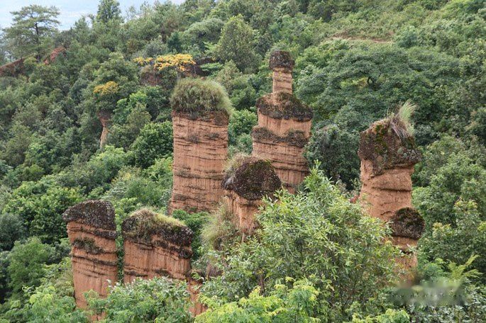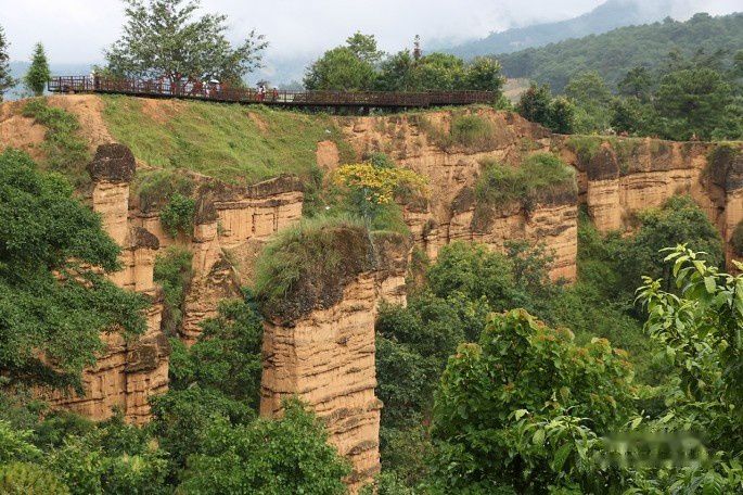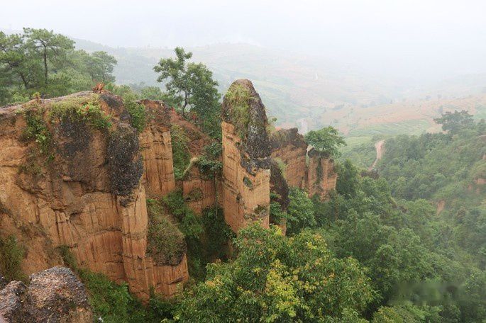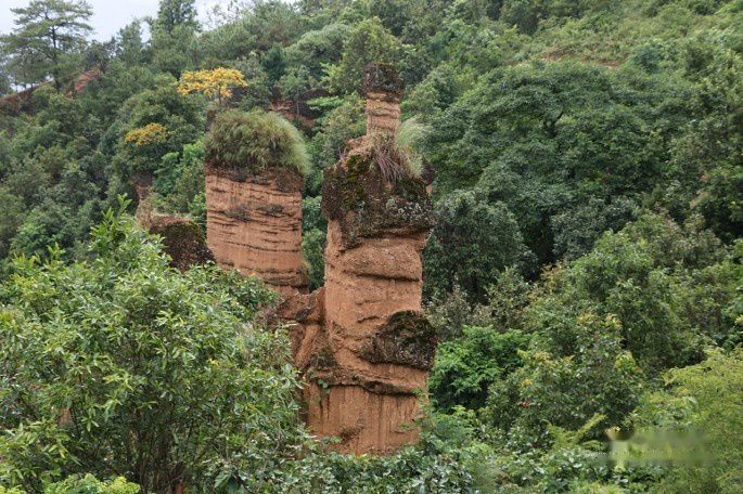 我离开栈道,行至左边土峰边缘。我俯视山洼,但见山包从中段分裂开,土峰陡峭如峡谷,尊尊土峰伸向天空,峰顶长有乔木与花草,仿佛丛林中令人神往的殿堂。