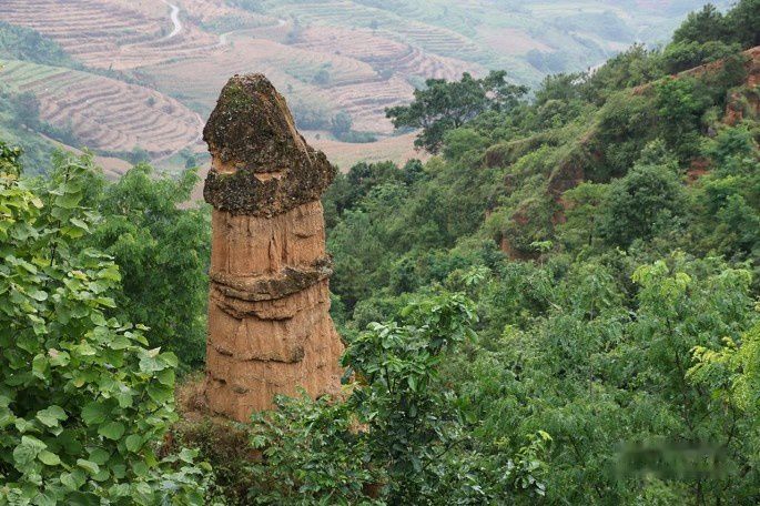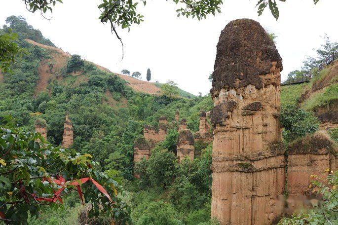 行至观景栈道,我俯瞰山洼,百十余座土峰矗立于葱茏的林木中,土峰与林木融为一体。每座土峰形状各异,高矮不等,高的达30米。笔直高大的土峰立于山间,形似柱,貌如塔,粗犷,秀美,气派,壮观。