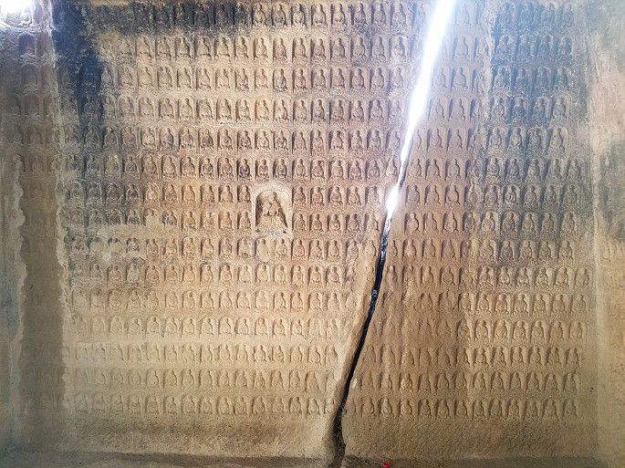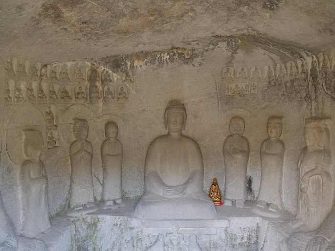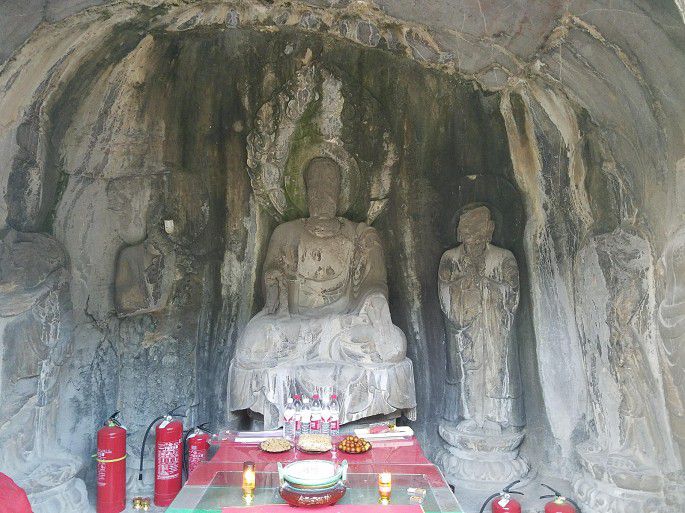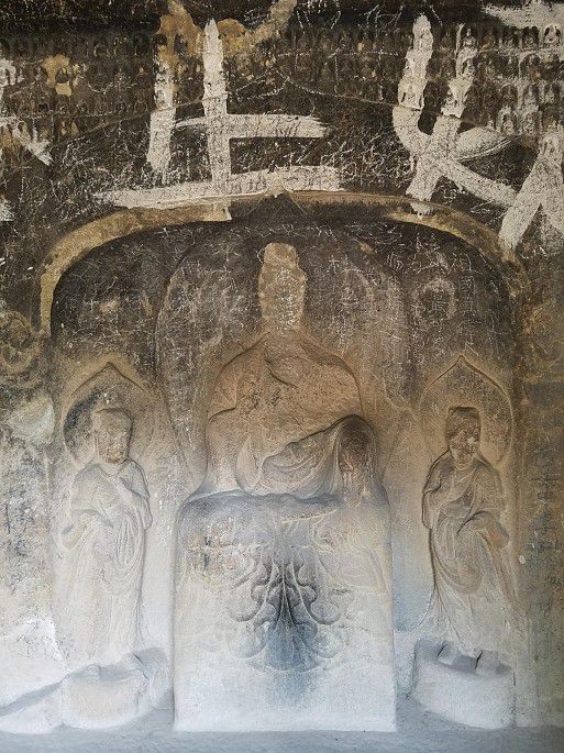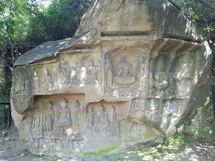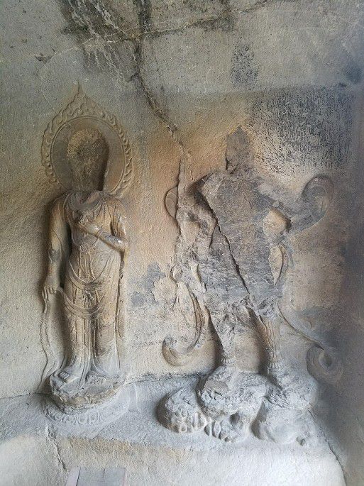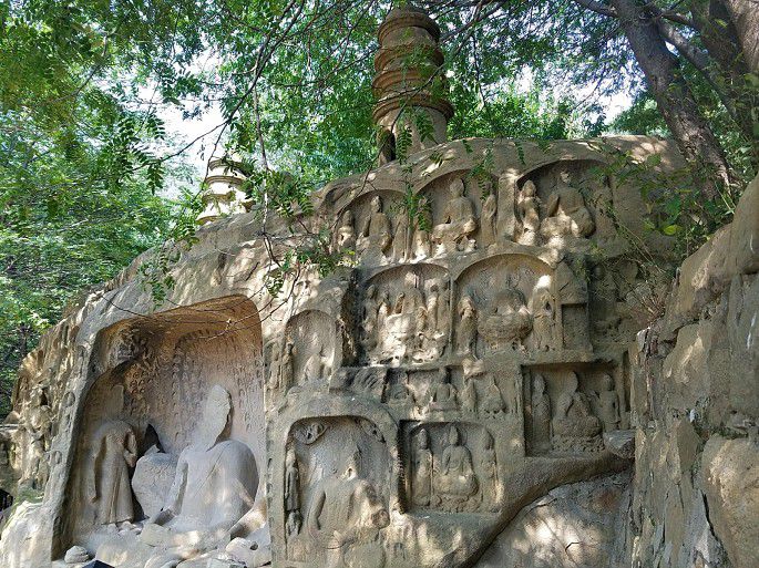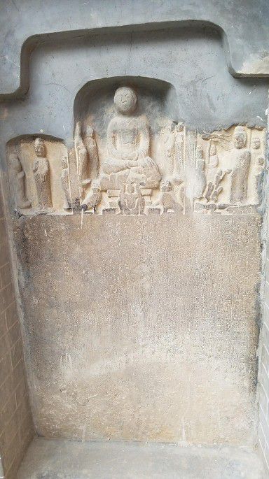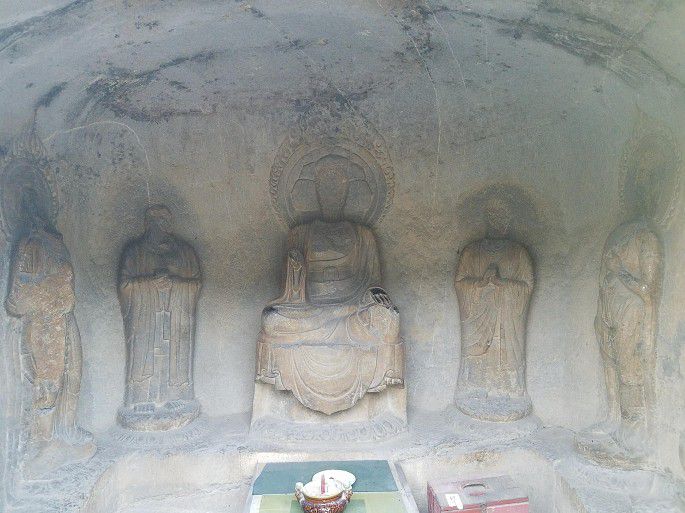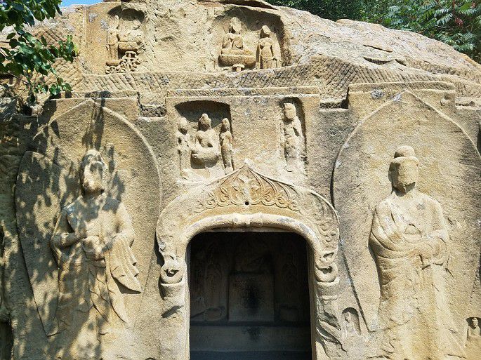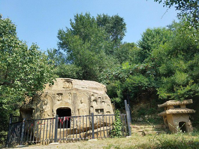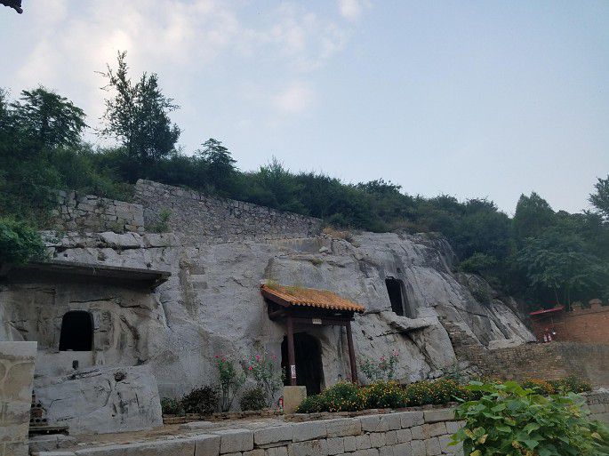 寺内建筑和佛像都为后建,只留一明代古碑,但高高两层及三院并连的气势已显曾经的红火。遗存价值自然是东院内三个石窟,依壁而凿,以西窟为好,题刻、佛像俱存,南北朝时期的作品,内容主要是佛、菩萨、弟子、武士、供养人等,隽秀精美,气韵生动。其它两窟相对差些,雍容典雅,唐风显著。院子蔬菜成畦,透着清新。