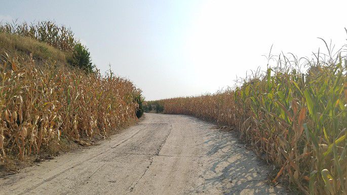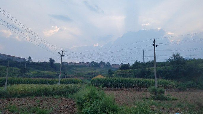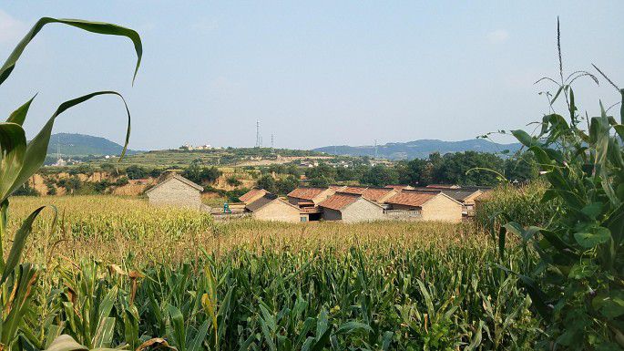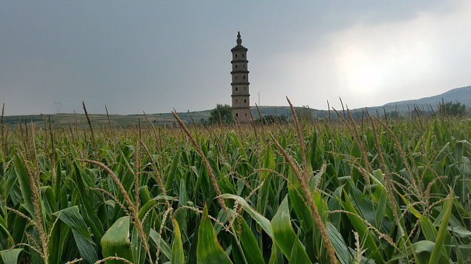 东周村告拜小伙儿,沿小路去大周村,不足两公里。过一老宅和大门紧闭的万佛楼,见玉米田中关帝塔伟立,其时雨下起。后不多会儿到大周村,雨停太阳出,如孩子的脸。