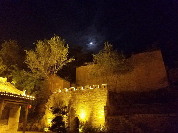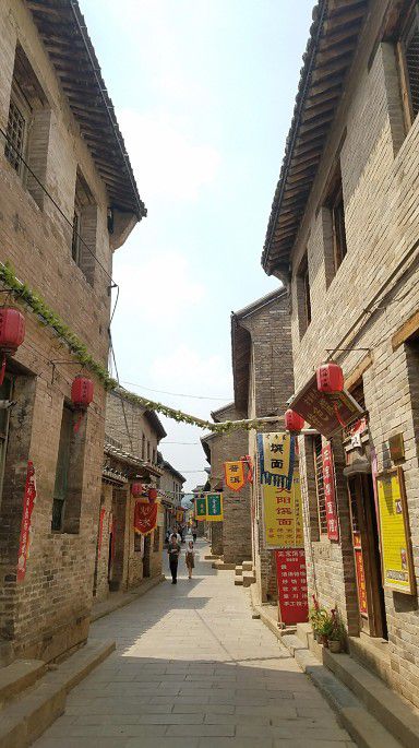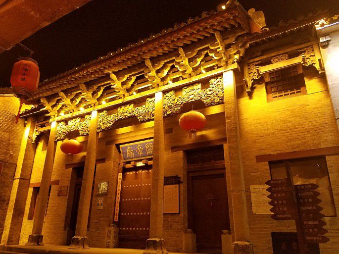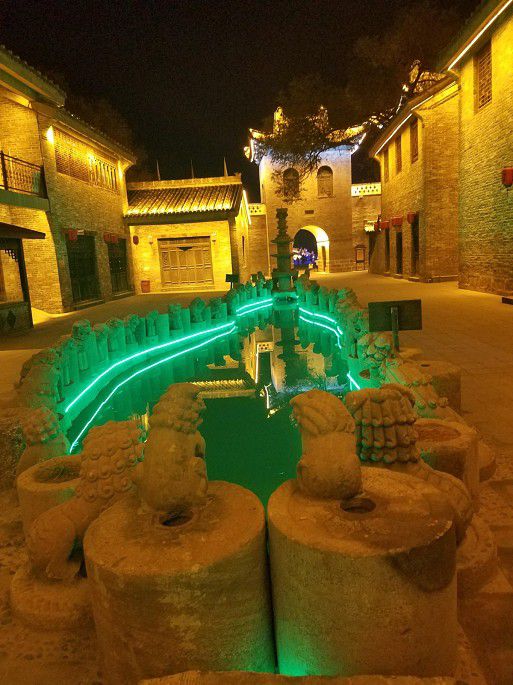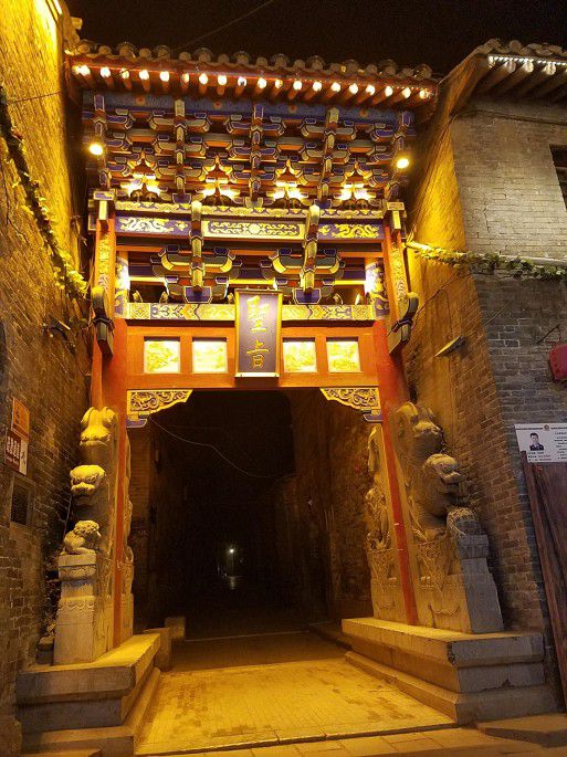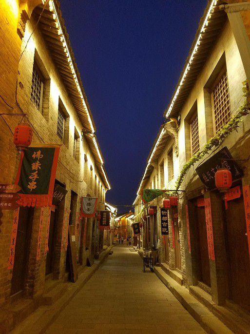 阳阿新街下,由一片老宅子入去,先见张都堂院,房屋上扇形、圆形等各种形状的窗户,各有寓意,富有地方特色。后到东大阳老街,灯火辉煌,店铺鳞次栉比,游人也是不少。大阳古称阳阿,秦汉就已为县治,以制针出名。如今投入心力财力,精心布造,新老交融,效果不错。
