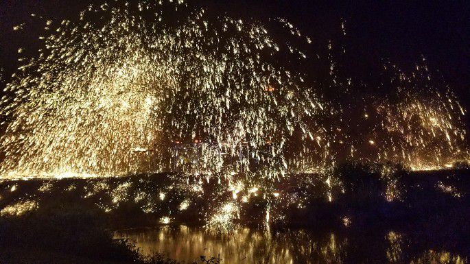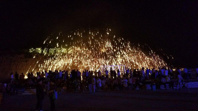 新街尽头有广场,刚好每日表演的打铁花开始,在小河对面的高地上。火树银花,阵阵喝彩,更添夜之魅力。