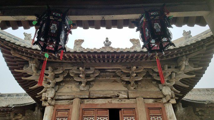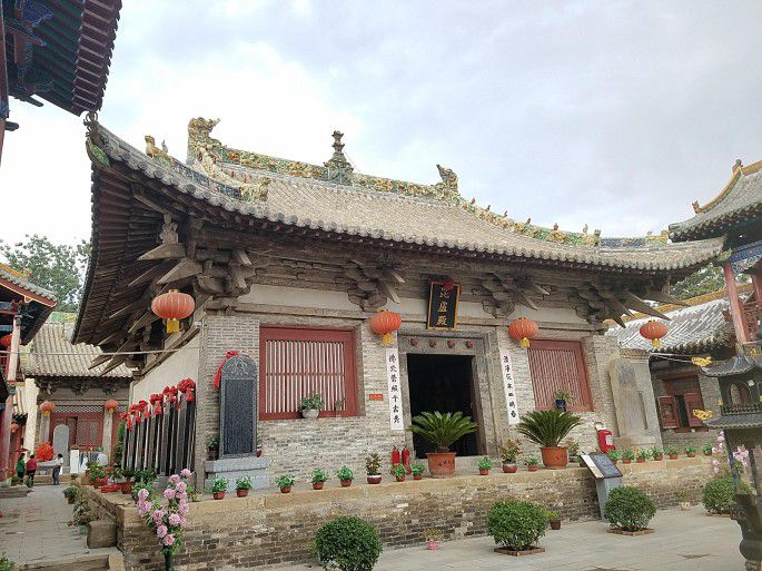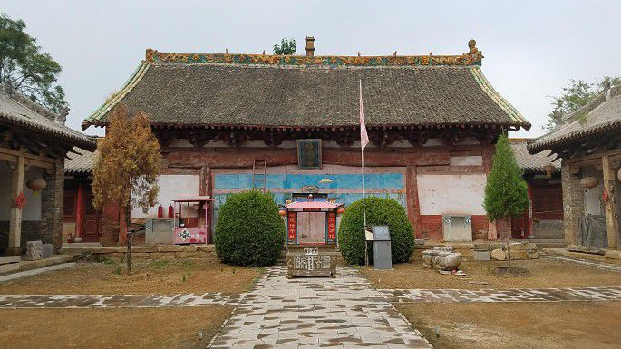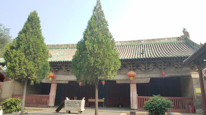 庙门敞开,一览无遗。庙内无梁殿(又称献亭)为元代建筑,其余皆为清代重修,山门外筑东西戏楼。无梁殿元风浓浓,内施八角形藻井,异常漂亮。正殿檐下木雕和石雕也还精巧,别无什么。