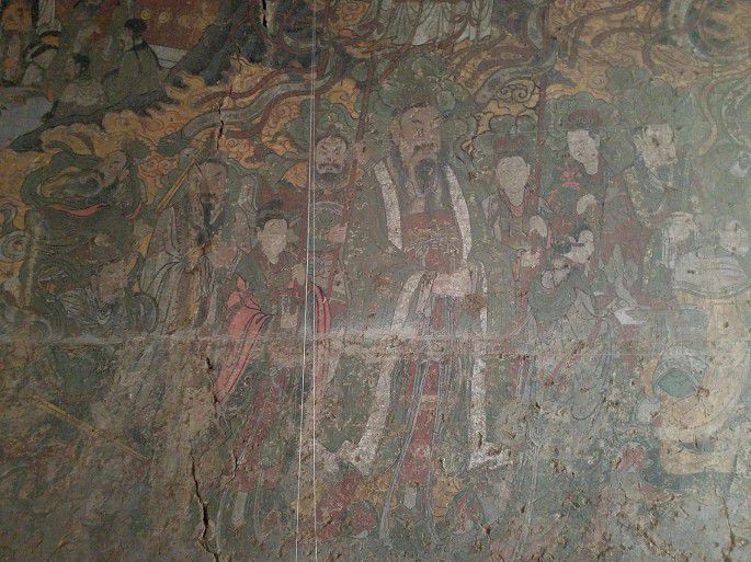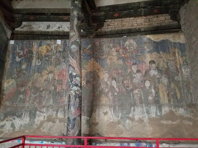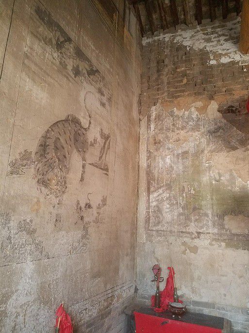 随后到西门真武阁和村北火神庙,隔捅破的窗纸隐约可见庙内壁画,已明显不如二十年前鲜亮。