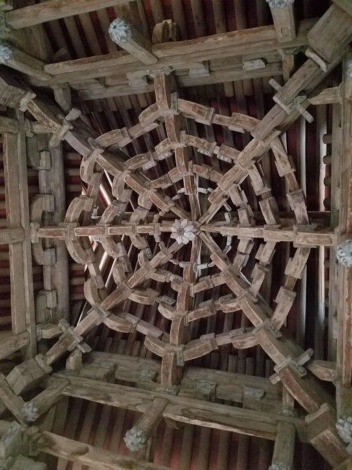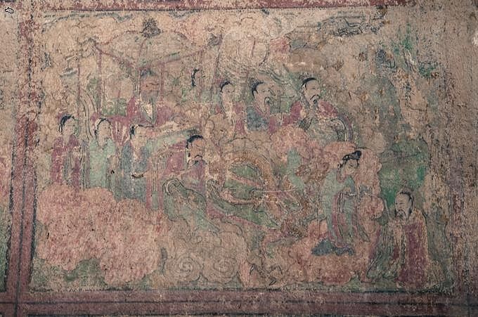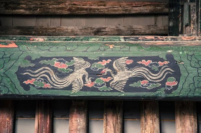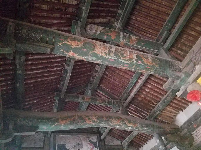 寺内主体建筑中殿为三清殿,元代遗构,殿内梁架上施漂亮的团花和龙凤彩画,四壁满绘连环画形式的道教故事壁画,就更令人叫绝了。可惜老汉不给开门,说是不允许。