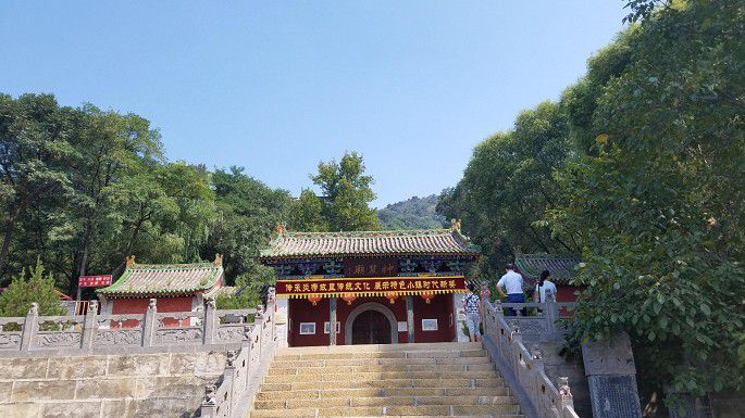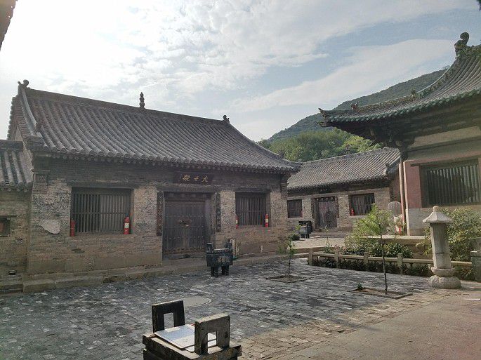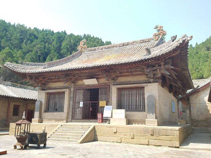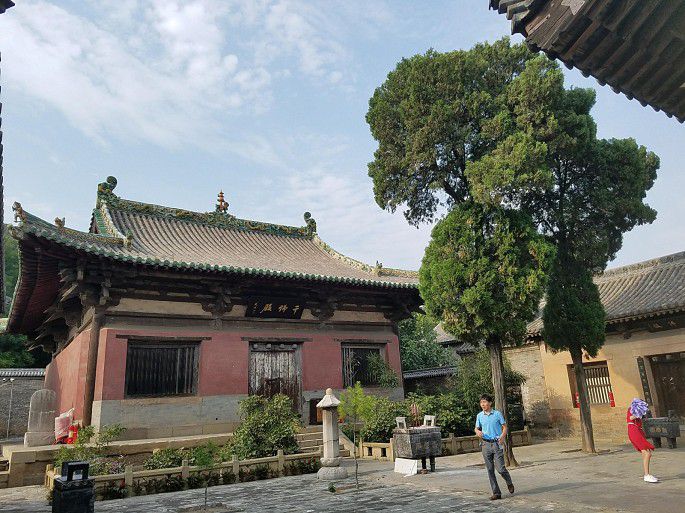 矿务局那三口刚好也要去崇庆寺,顺带捎上咱。约七公里路程,很快就到了,琚村北紫云山麓。过有500年树龄的白皮松林和前寺(三嵕庙),先去后寺。没成想,又吃闭门羹。前后门敲喊半天,只听狗汪汪,不见人声响。老半天,估计里边的人终于耐不住了,才开了门,看护员和文管所的各一个。理由还是七月十五日子特殊,这里的规矩是下午上坟烧纸等等。而且,拿钥匙的办事没归,不能进殿内细细品赏。
