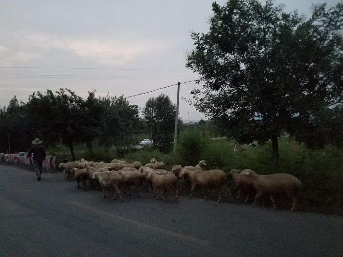 出庙回到大路,边走边拦,不是满员就是没搭理。一大群羊咩咩叫,回家喽。走到往羊头山石窟拐的路口,见有人烧纸。镇上小店门口几个老人在看电视,当地戏曲,蛮好听。吃东西,宾馆住下,还不错。
