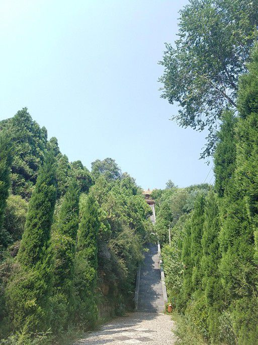 一户人家门前几个妇女在打搓谷子。过一牌坊,见树丛掩映下的养心湖——王村水库。路修的好,两列柏树青葱。十多分钟到舍利山南麓,沿陡峭的台阶而上,即见开化寺。山间古刹,悄无声响。