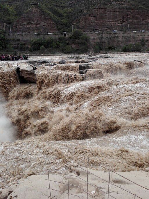随着上游降雨量增加影响,黄河流域进入汛期,晋陕峡谷水量大增,滚滚波涛奔腾而下,壶口瀑布主副瀑布连成一线,形成壮观瀑布群,颜色也逐渐变成金黄色,呈现出雾雨翻腾水中冒烟的迷人景象。