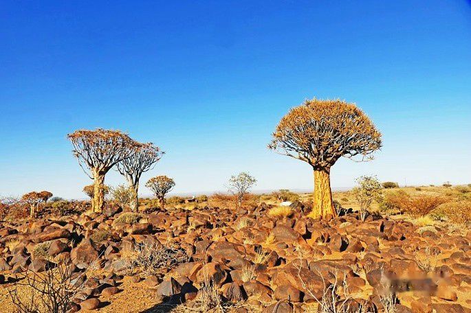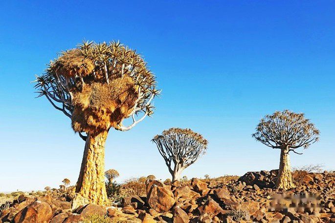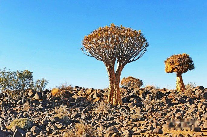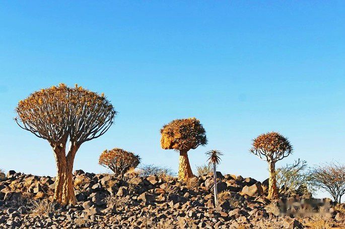 这些树高达5米,拥有200年左右的历史。而貌似大树的箭袋树并不是“树”,它是一种特殊的树芦荟。最高能够长到20米以上,是最大的芦荟之一。