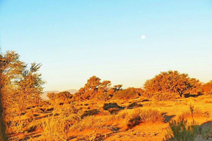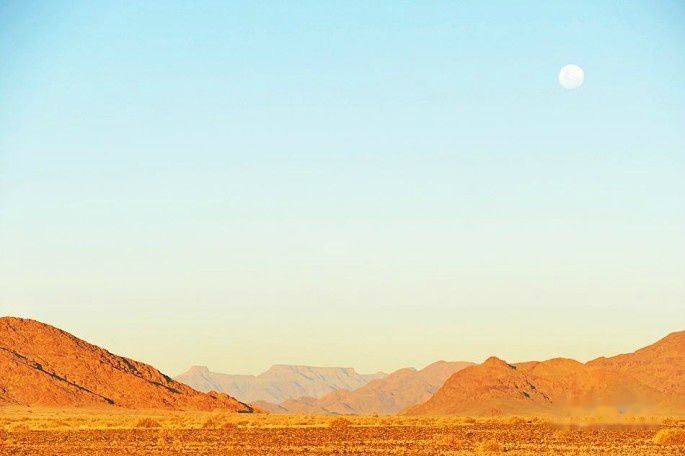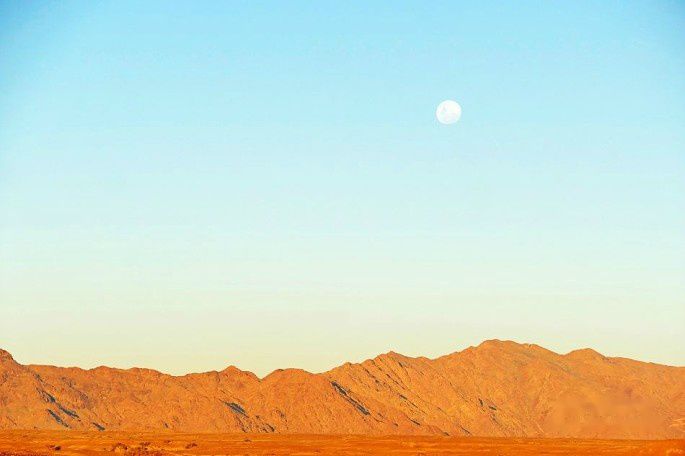 回程路上黄昏时分,月亮为红色沙丘添彩。