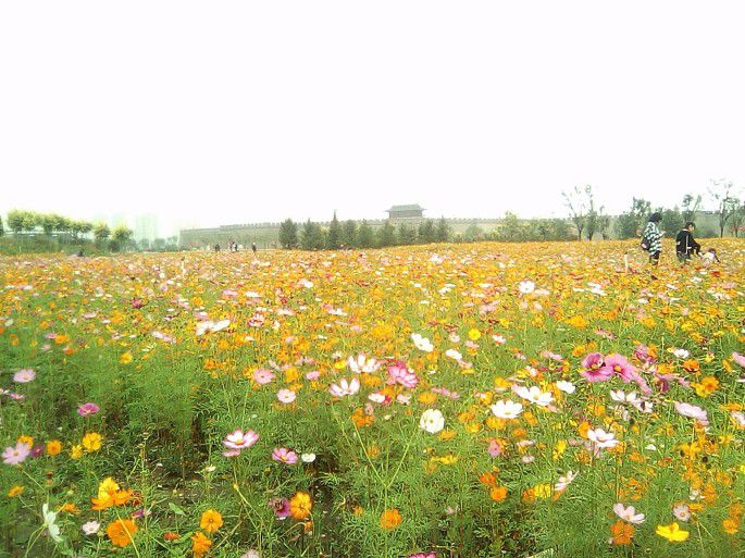 改革开放,国运渐隆。旧城重建,再现遗风。中秋佳节,相携游城。城外花海,美丽繁盛。