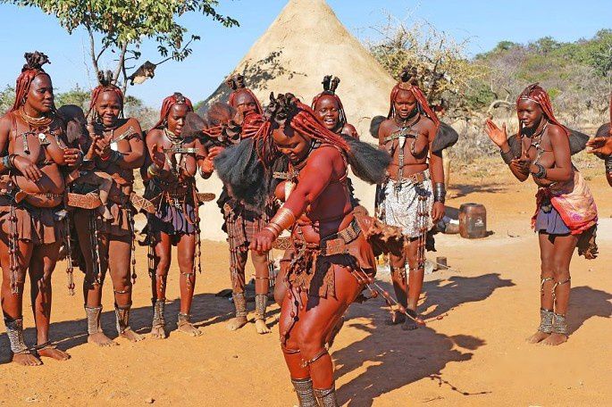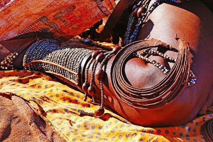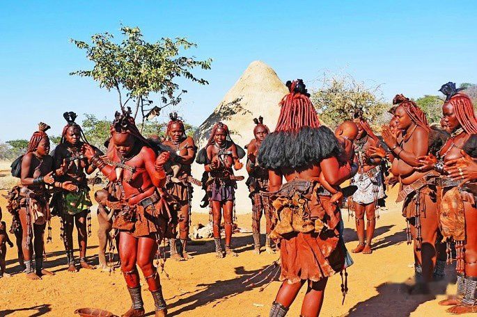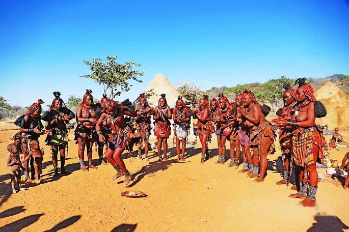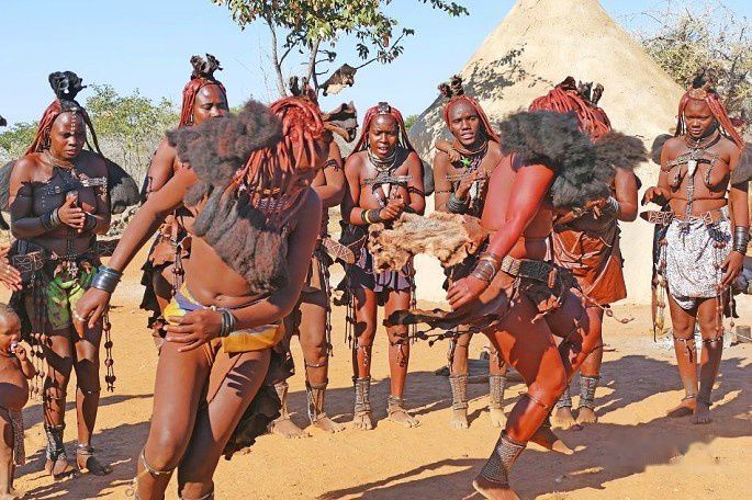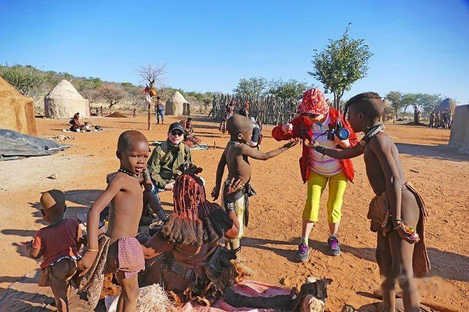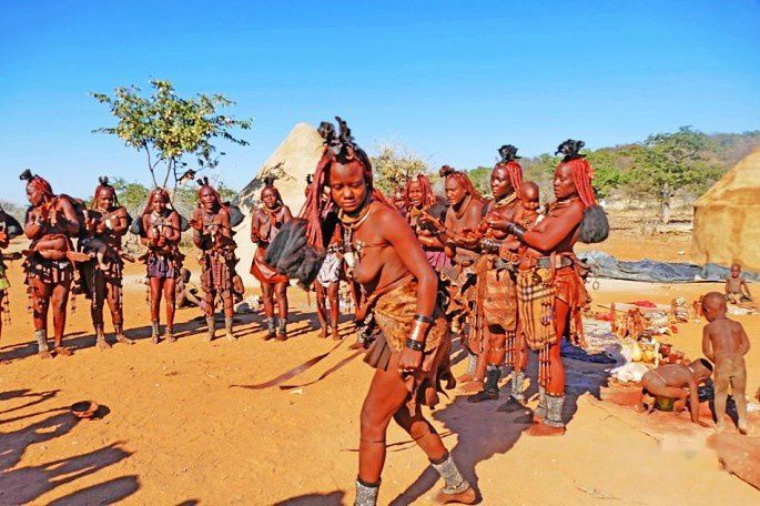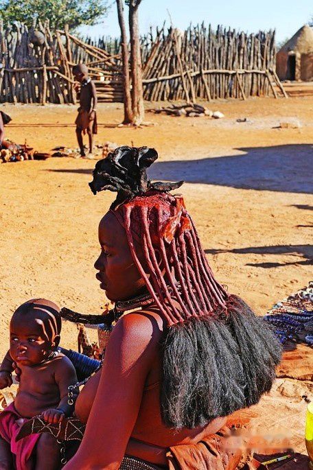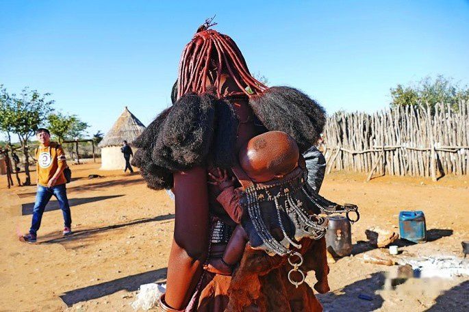 这一天离开埃托沙国家公园,去探访一个即将消失的古老部落——辛巴部落。辛巴人17世纪从安哥拉高原迁徙到纳米比亚,一度成为非洲大草原上极为富庶和强大的游牧民族,但如今,他们依旧停留在原始状态,生活在远离现代文明的偏远地方,聚集在一个个孤立的小村落里,维持着500年前的生活方式。辛巴女人常年袒露上身,特别是,她们把一种红色石粉和着奶油涂抹在身上,头发也用这种红泥巴裹着。这种红泥可以抵御烈日的暴晒,还可以防蚊虫的叮咬,因此被称为红泥人。
