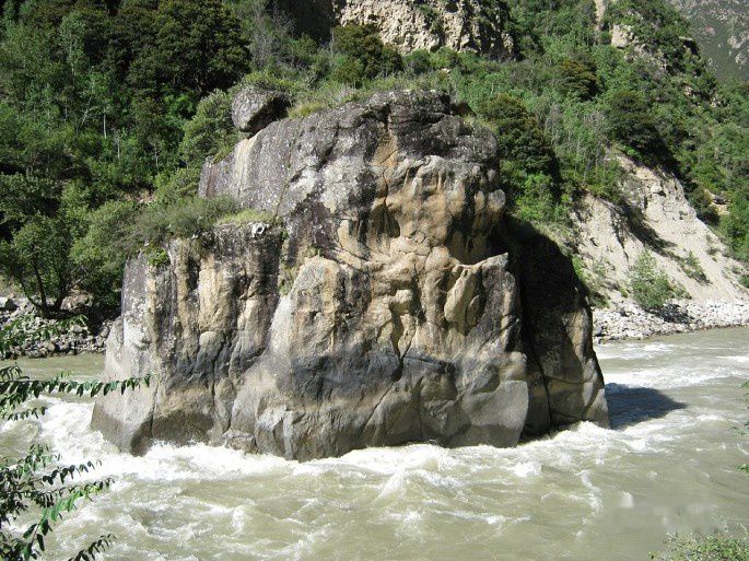 这一路有几个景点:5点到两棵杨树,路边两棵杨树极大,估计3人搂不过来;5点半到中流砥柱——尼洋河中的一大块孤石,因为这里前年曾淹死过游客,被路政用彩钢板护栏上下遮挡了几百米。我冒险爬上护栏才拍到全貌,可惜无法与之合影;6点到大昭古城,一处较大的人文景观,在尼洋河对岸,古城保护很好,也有居民居住,可惜天色已晚,只好拍几张照片,遗憾而去;7点到仲村,有新桥可以过河,过河可以看到山崖上有壁画,山崖下有一小寺,估计供奉的是当地活佛;7点半经过尼洋河第一峡谷,峡谷正在建一座新桥,估计也是旅游开发。