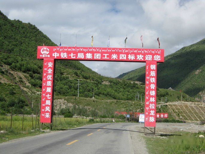 早上8点半出发,仍然是沿着尼洋河朔流而上,一路没有大景点,但风景宜人,高原乡村,屋舍俨然。早晚阳光斜照,被高山所挡,明暗参差,色彩绚然。这一路沿318国道正在修林拉高速,大吨位的工程车来回穿梭,各地工程队都在自己的标段竖起彩门,两旁写上自己需要的口号,一派繁忙景象。
