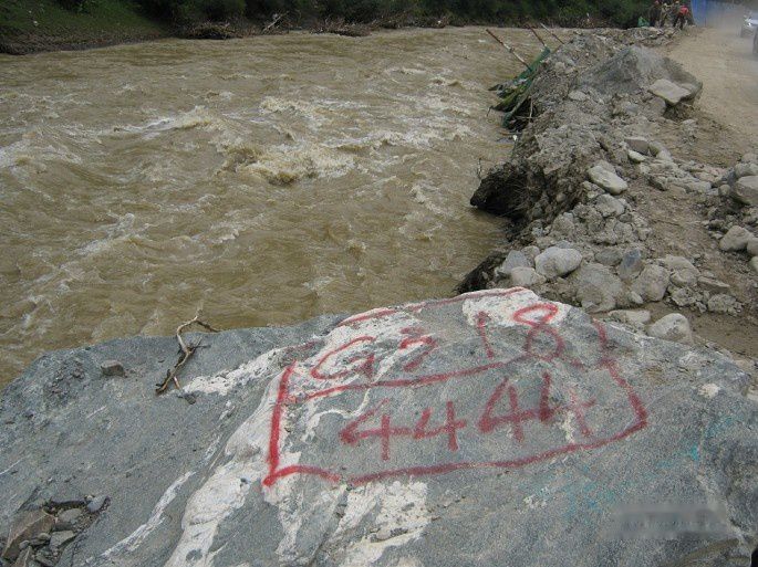川藏线上一路骑行过来,在重要的里程碑前都要拍照留念,因为好不容易来一趟。318线的4444公里碑就在这一段,骑到4440时先拍照以防不测。果然到了4444公里位置,里程碑因为修林拉高速被掀掉了。问当地一个施工人员,他说在前面有写的,果然在一块大方桌的石头上用红漆喷了4444的石碑,紧靠尼洋河边躺在地上,不容易呀!拍照纪念吧!下一次一定见不到这样的里程碑了。