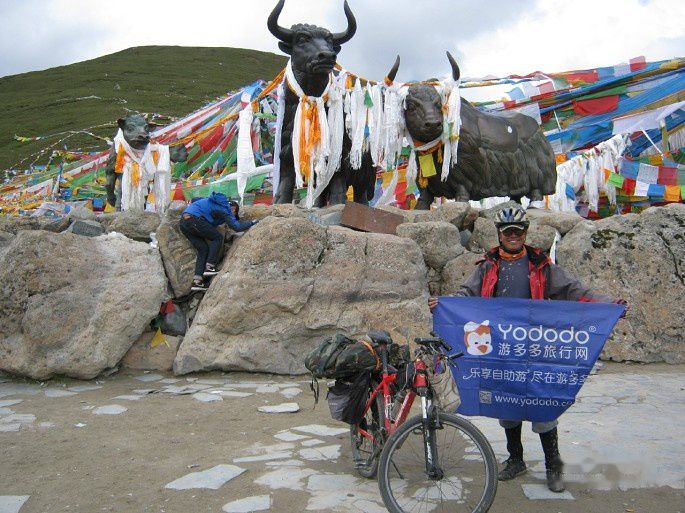 早上8点半起床,发现几乎所有的骑友都出发了。赶紧洗洗去食堂吃饭,已经没有人了,剩馍稀饭还有,努力地多吃一些。9点出发,一路上坡。天真是蓝呀!没有云彩的时候,在这样的高度,这样的无污染的环境看天,那是一种深蓝,透彻、澄净。人们给它的专有称呼叫西藏蓝。