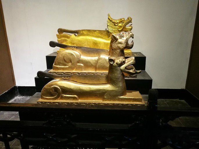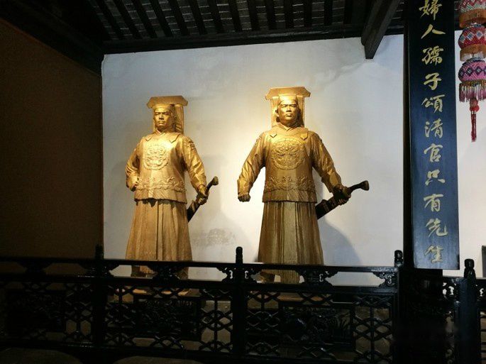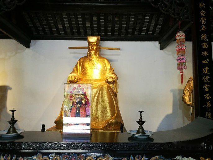 主建筑是包公享堂,端坐包拯高大塑像,壁嵌黑石包公刻像,威严不阿, 表现了"铁面无私"的黑脸包公的凛然正气。