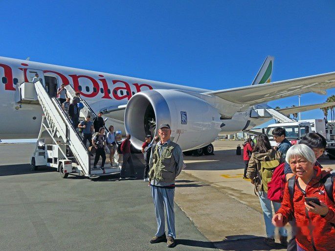 出团通知要求当晚8点半在T3的6号门海关处集合。由于怕下班高峰堵车,所以我们5点半就离家了,到四通桥的民航大巴站,晚6点正式发车。一路上想不到的顺利,7:20就到了T3的6号门,整整提前了一个多小时。于是找了个地方休息等候。8点半小韩领队集合,简单交代几句就先办理登机牌。8:50托运行李换登机牌,5分钟后自助通关。9:25过安检,9点半到E31候机。晚10点,小韩领队开始集中给大家讲解行程看点和注意事项等,讲得很细很全,说明韩领队是个很负责的人。晚11:10开始登机,半小时后落位。我们乘坐的是埃航ET605,预定0:10起飞,实际上0:24起飞。大家立刻进入睡觉模式。