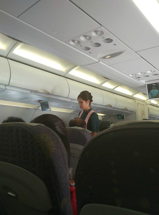 我们乘坐的是台湾长荣航空公司的旅游包机,空姐不如大陆航空公司的空姐漂亮。