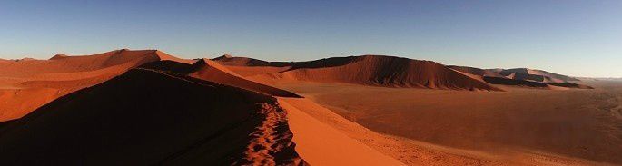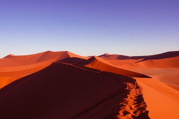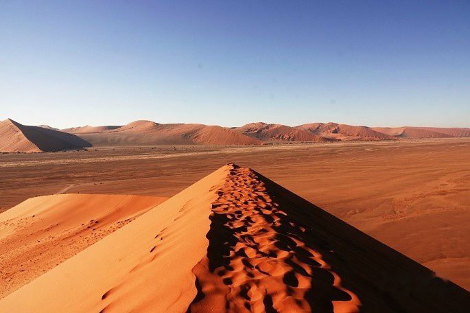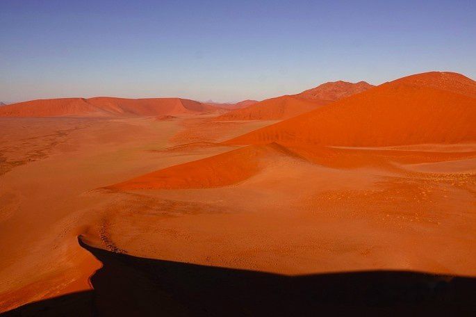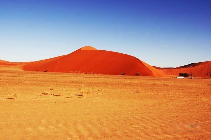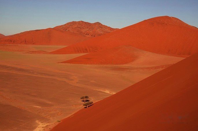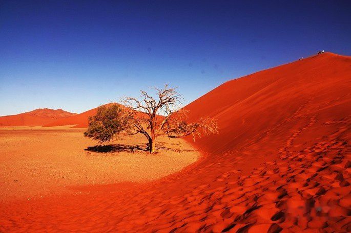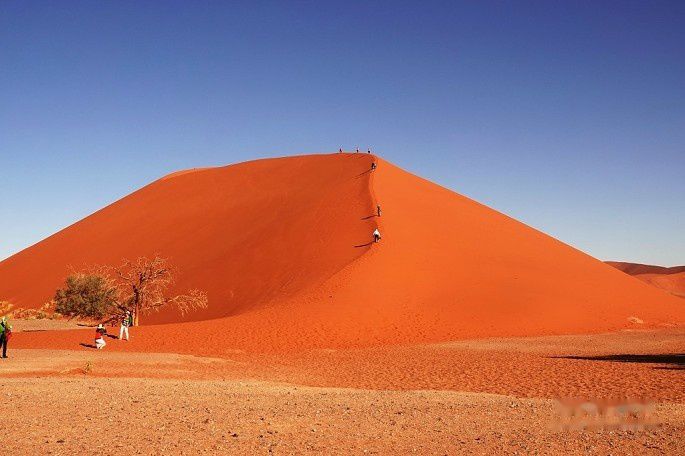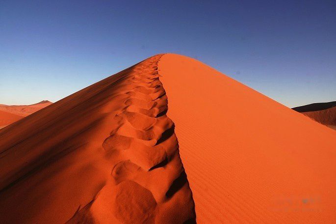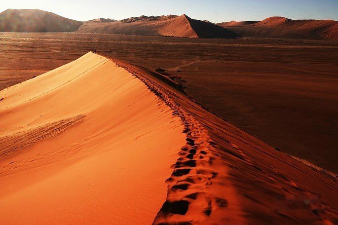 12:40发车,下午1:15到达GONDWANA NAMIB DESERT LODGE酒店。放下行李,1点半午餐。下午2点半出发去红沙漠,2:49进入诺克洛夫国家公园的大门,3:38进入SUSSUVLEI红沙漠的景区大门,4:20到达45号沙丘。45号沙丘距离景区大门45公里,坡度几乎45度,是唯一开放的三个沙丘之一。这里的红沙漠之所以发红,是因为富含氧化铁,且沙丘是固定的并不流动,沙子很细,非常漂亮。我一直向上,登上最高处,我们团队只有我和老焦登顶了,其余都没能上去。站在沙丘顶环顾四周,真的感到很美很美,尤其是夕阳下沙丘的影子勾勒出极美的曲线,这真是大自然的造化。