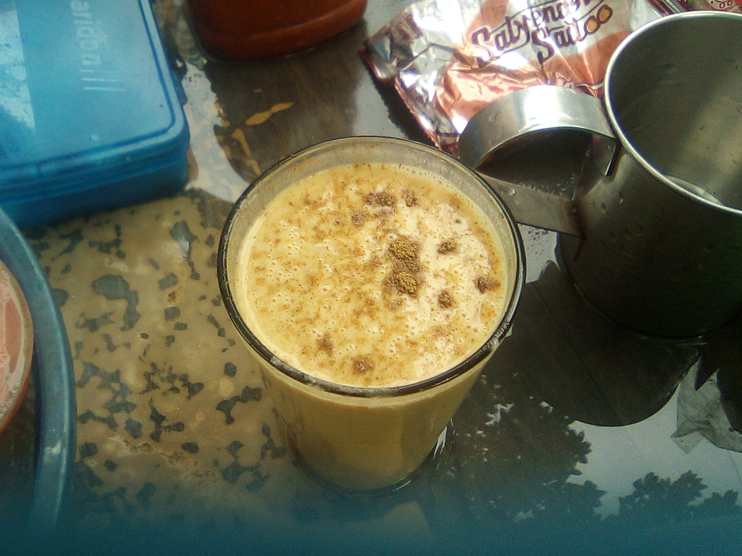在街头小摊上,喝到了传说中的印度奶茶。人家是现做的,配好了后递给我,我鼓起勇气开始品尝:那味觉真是难忘不太甜也不酸,有点像粥。咖喱的味道很重。我在一边喝,印度摊主和两位印度小伙子也好奇地看着我这个China 老外的反应!出于礼貌要表示喜欢,但是又确实有点别扭,我想当时我的表情也一定很怪吧。