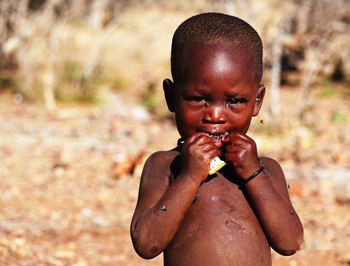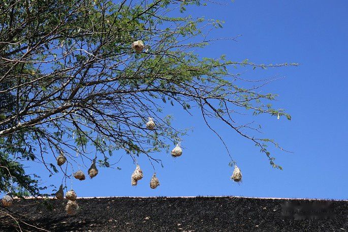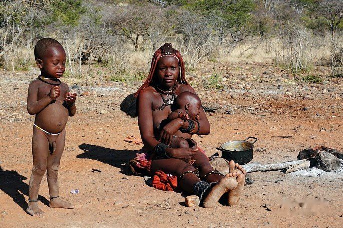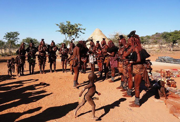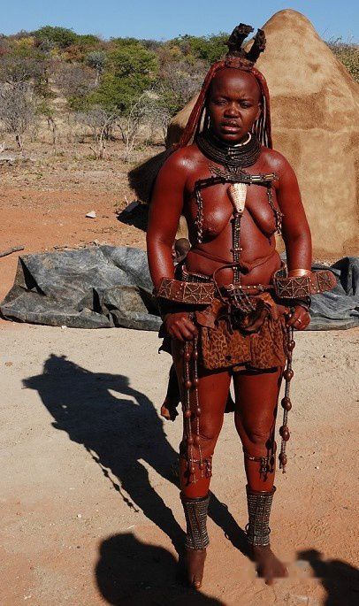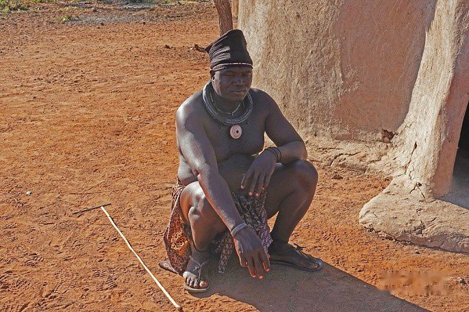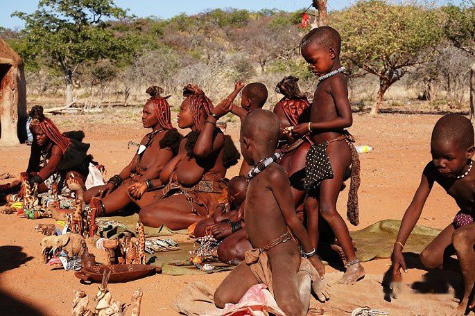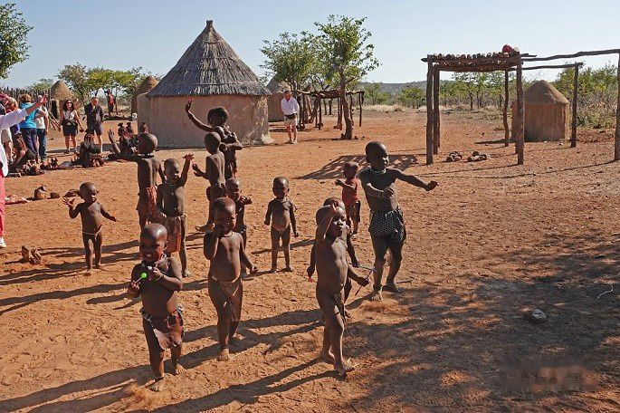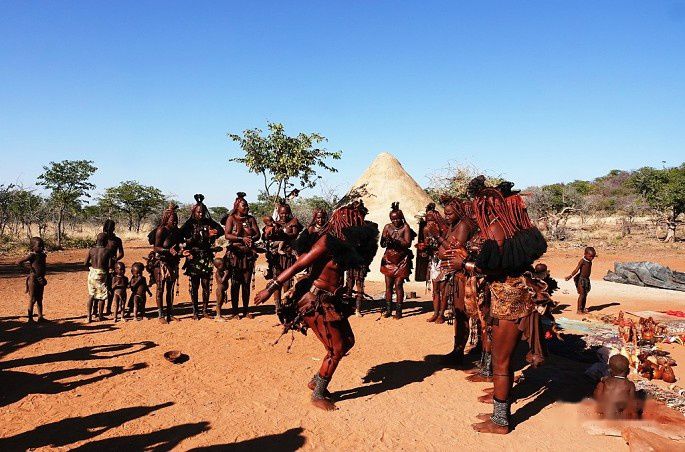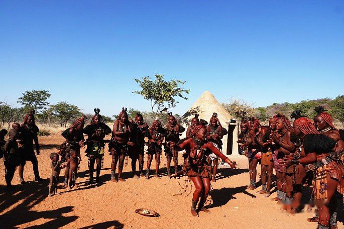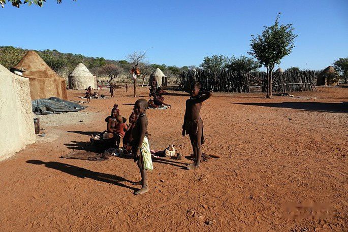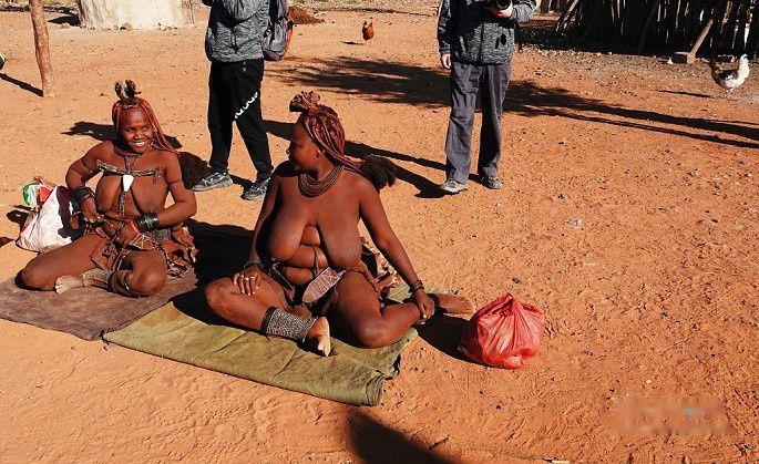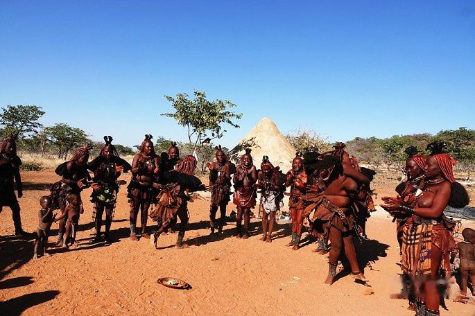 早5点起床,6点到水塘边看了看,没什么动物来喝水。7点半行李装车后早饭。8:20出发,离开埃托沙。路上拍有2~3米高的白蚁穴。8:10到了辛巴部落。这是一个原始的部落,特别是女人终身不洗澡,全身用红石粉加奶油等和泥涂抹,且袒露上身,俗称红泥人。部落不大,男少女多,很多男孩15岁就夭折了(基因的原因)。我们带去了很多糖果、铅笔等给了红泥人小孩,还每人交20纳币小费欣赏了女人们的歌舞,其中团队的成员还有即兴参与的。