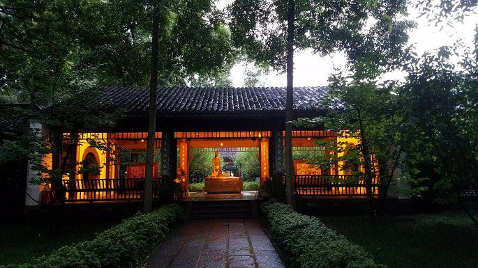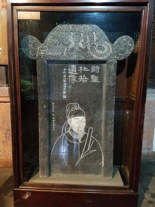 大雅堂内陈列12尊历代著名诗人雕塑,极具夸张。工部祠内有明、清两代石刻杜甫像,其中明万历三十年(1602)石刻杜甫半身像是草堂遗存最早的石刻像。万佛楼新建,但保留有当年的基础遗址以观,遗址上一只猫旁若无人,连正眼瞧一眼也不。茅屋自然也是后建,不那么显眼了。
