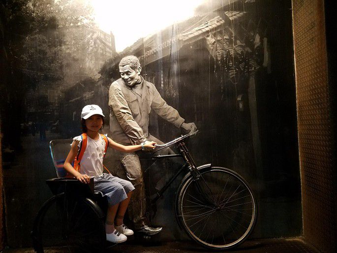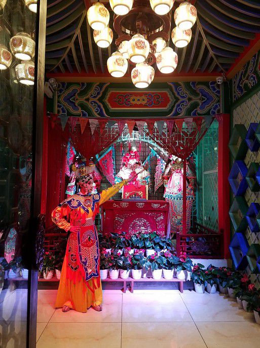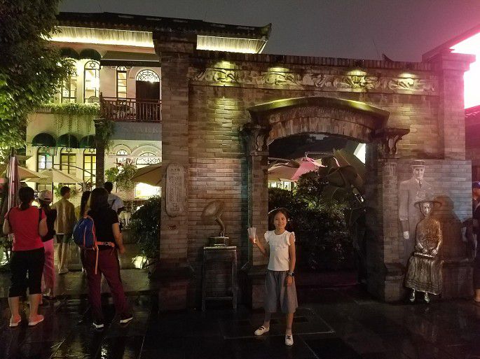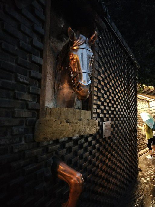 里面自然是各色店铺林立,琳琅满目的物品和服务,吃的喝的玩的乐的,应有尽有,却更多是外地客。最吸睛的还是各种怀旧色彩的民俗雕塑,如邮递、旗营、拴马石、砖文化墙等,还有恺庐和小洋楼,以及变脸玩具、熊猫和掏耳朵.....