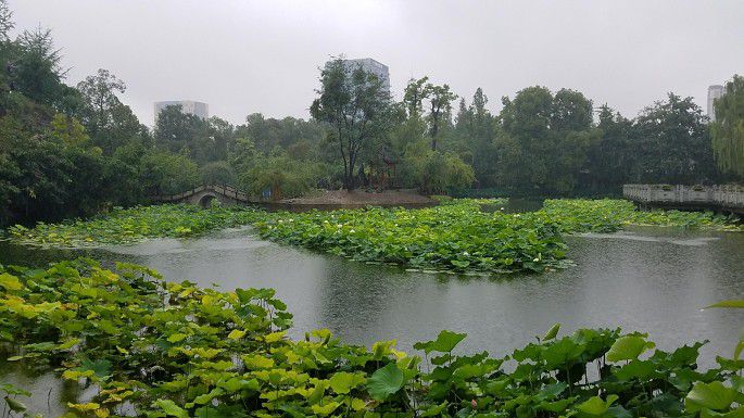 公园东门出,临街富丽堂皇,有戏楼和工艺品店。步行约二十分钟,到人民公园,里面有辛亥秋保路死事纪念碑和保路运动雕塑。公园正举办荷花展,满目漂亮之色。