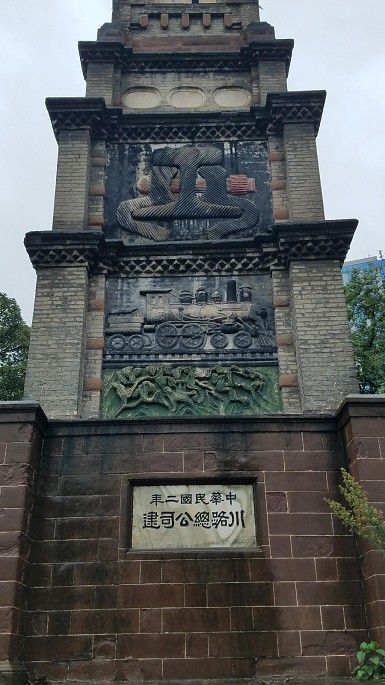 纪念碑够高,由碑台、碑座、碑身、碑首四部分组成,呈圆柱形。碑座四面有铁轨、火车头、信号灯等浮雕图案,碑身四面都刻有“辛亥秋保路死事纪念碑”字样,分别用楷、草、行、隶4种字体书写。设计匠心,作品怡人。