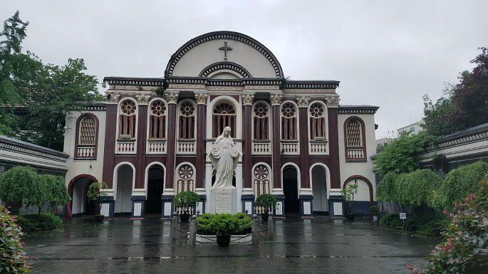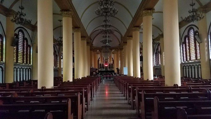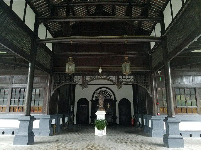 雨渐停。由公园去附近的平安桥天主教堂,步行十几分钟即到,小巷深处。里面不小,近大门处有餐饮经营。向内,肃穆庄严,宗教氛围。大礼拜堂内静坐二女一男,男的象游客,一女跪祷经文,一女静坐有所思,特有点特异的情境。