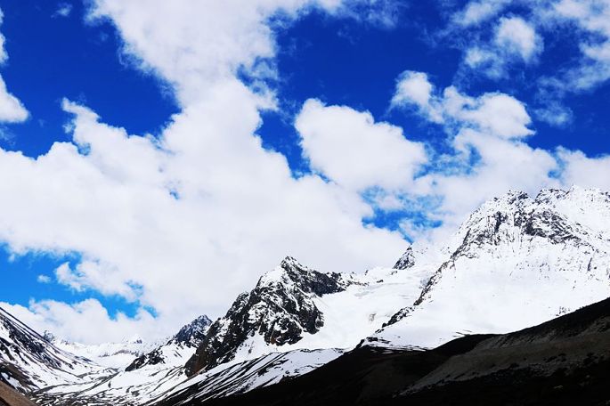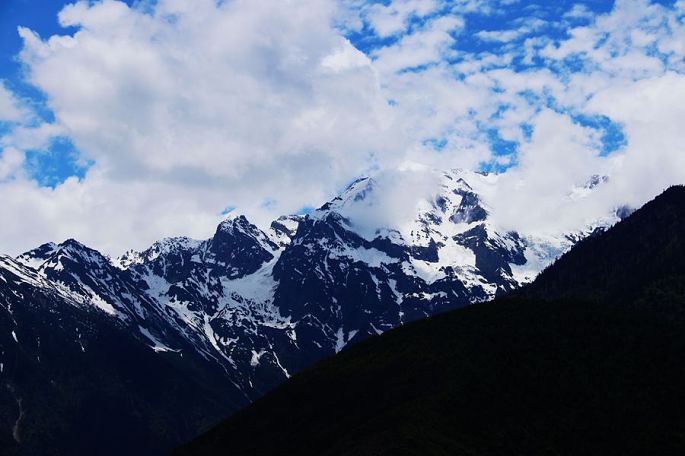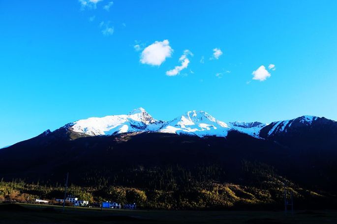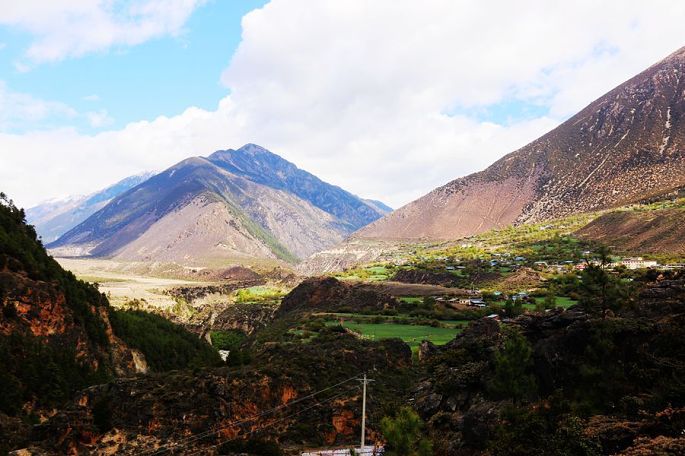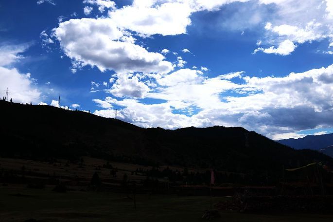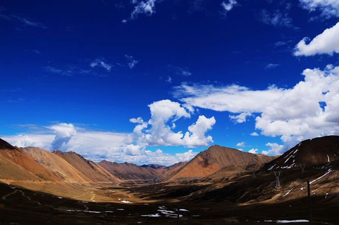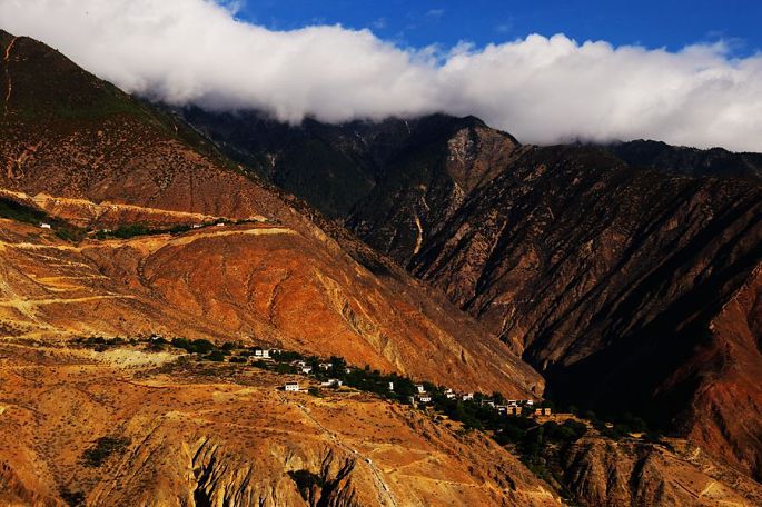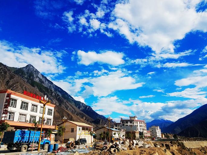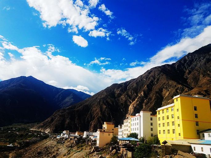 进入西藏境内后,山色由绿色慢慢变为枯黄,显得荒寂没有一点生气,但察瓦龙这里的天却很蓝,云团很多、很白。
