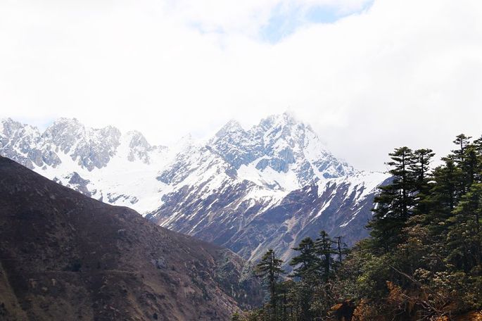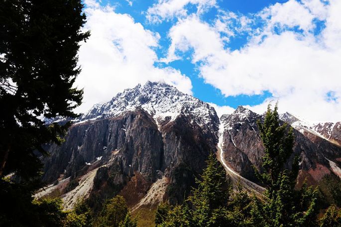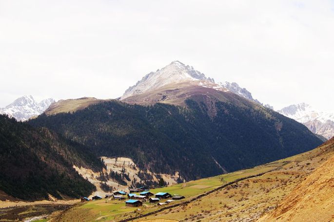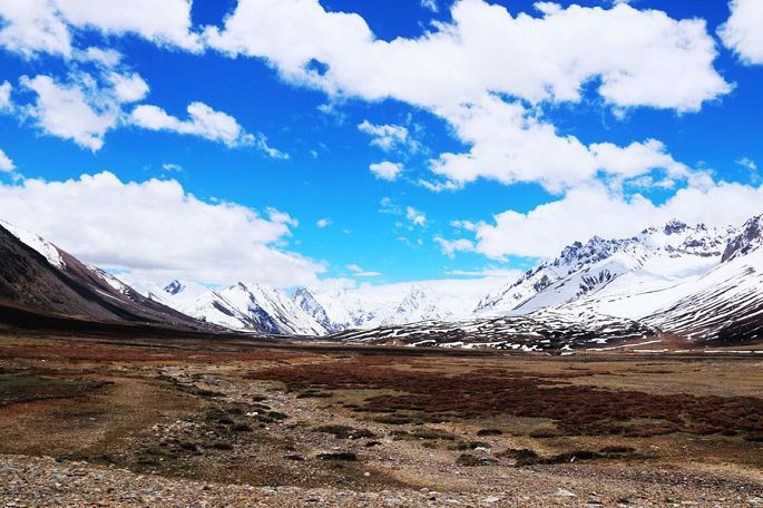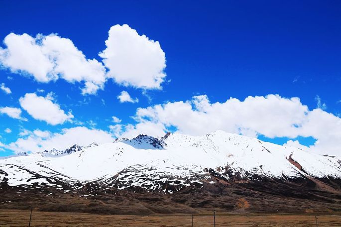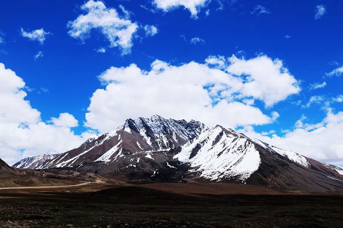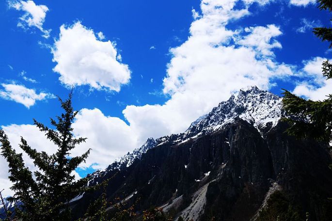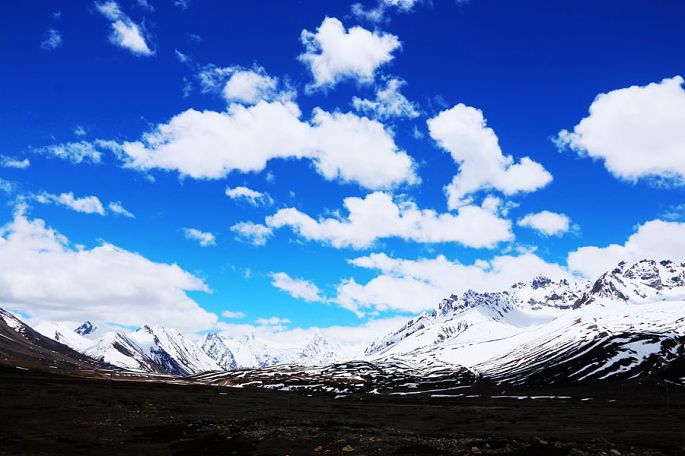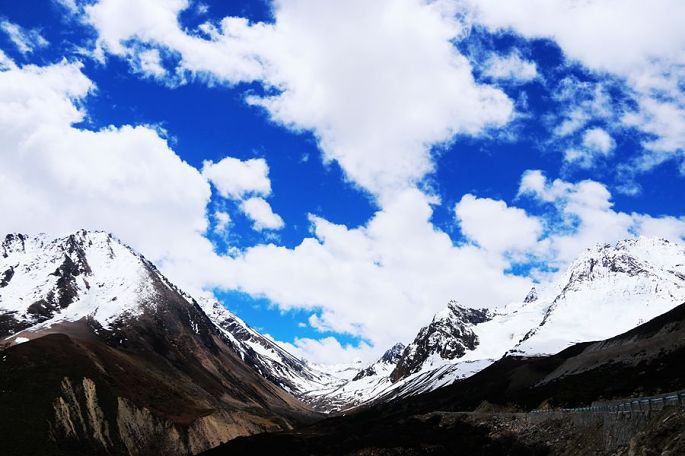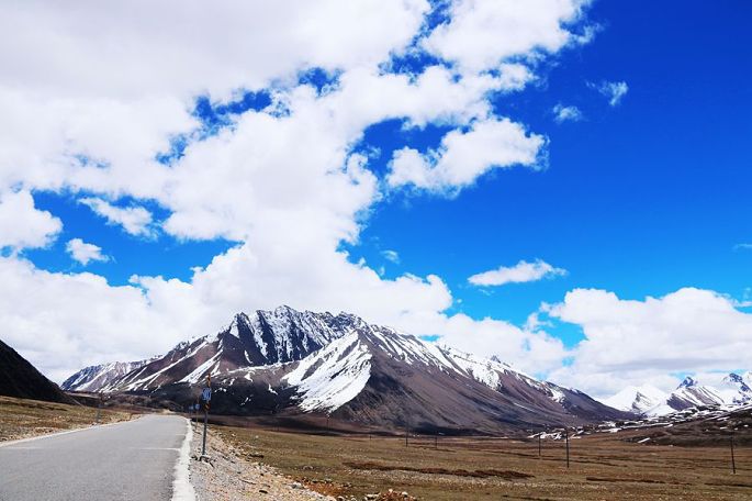 进入西藏境内后,山色由绿色慢慢变为枯黄,显得荒寂没有一点生气,但察瓦龙这里的天却很蓝,云团很多、很白。