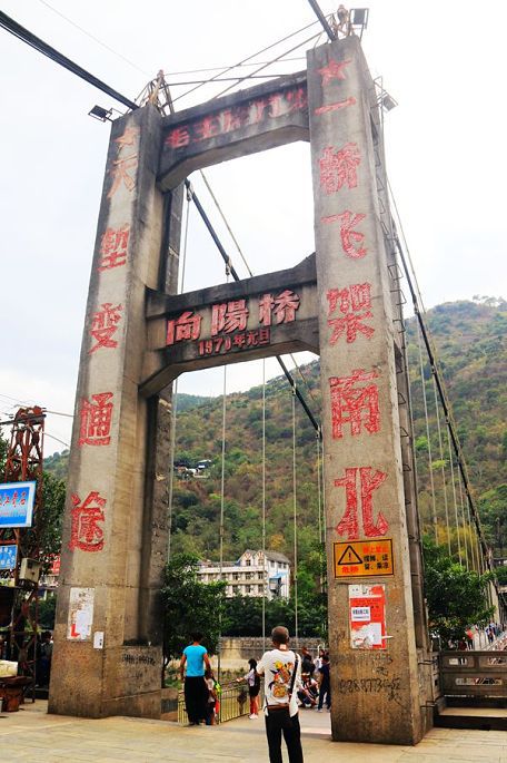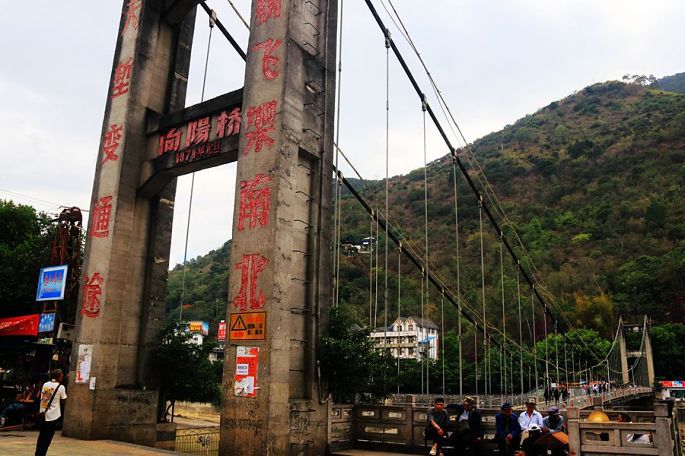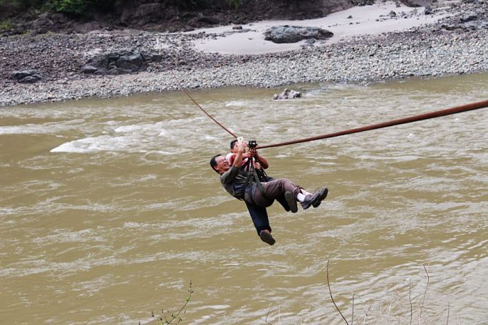 离开澡堂,接着就去旁边不远处的江岸,感受另一件更为惊险刺激的项目——溜索。在当地一村民的帮助下,并和这位村民一道,套上绳索,挂上滑轮,走起,俩人便一块儿嗖嗖地溜过涛涛怒江江水,短短十几秒,就横跨到达了对岸,之后下来徒步上到高处,换另一根溜索,如法炮制,再溜回此岸。由于近年当地公路的不断建设,这种传统原始的交通方式和手段,已经渐渐不为当地人们所使用,现在已主要用作旅游项目,供外来游客体验使用了。