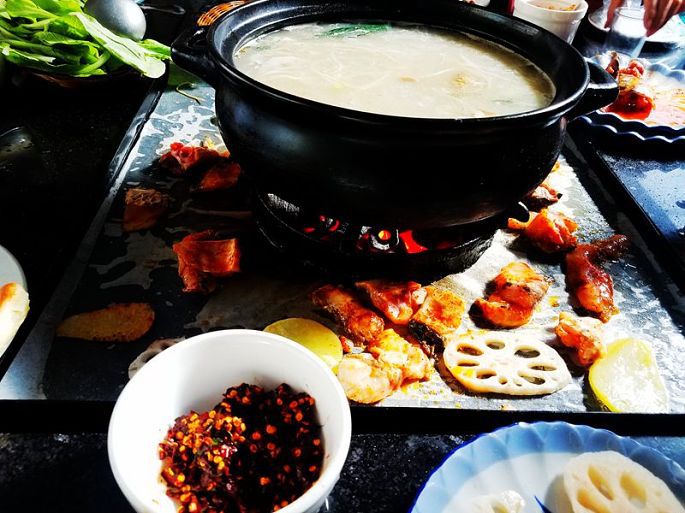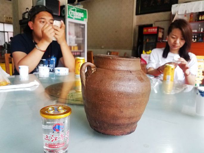 到酒店放下行李,简单收拾后,小黑带着我们,一行5人徒步经向阳大桥前往城里,找到饮食城,在其中名为“通甸一家人”的店里吃晚饭,吃的是特色漆油鸡、乳饼,喝的是三江荞酒,大陶罐是用来泡茶的。此行一路的饮食,基本以川菜为主,应该说是很对我的口味的。