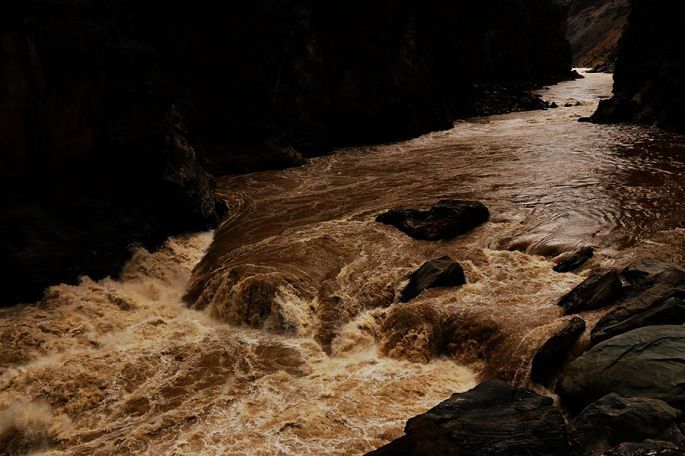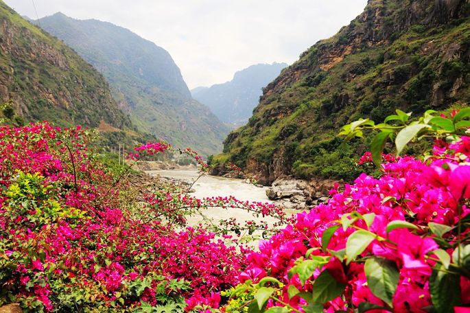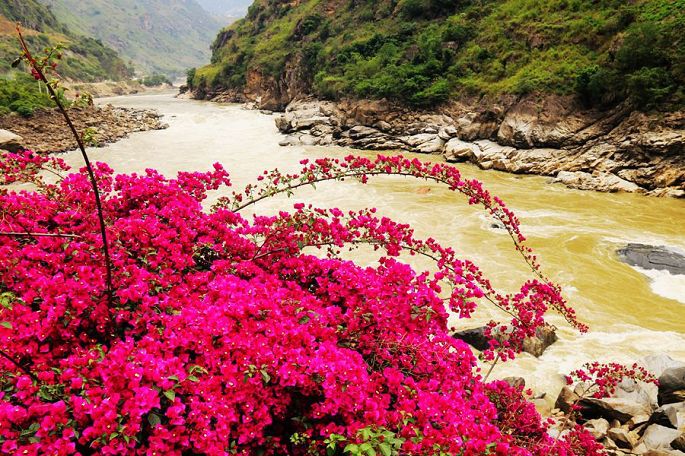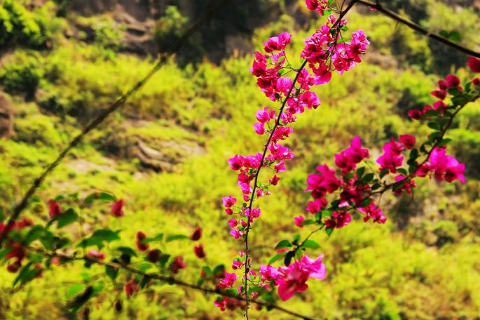 令人意外而又惊艳的是在这峡谷深处、汹涌激流的岸边,居然还生长有簇簇明媚娇艳的花卉——三角梅,这也是我最喜爱的花卉之一,这一动一静,一黄一红,形成了极大的反差,恰似阳刚与阴柔的交响。