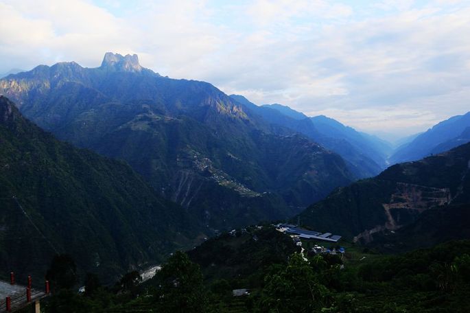 老姆登村,属怒江州福贡县匹河怒族乡,“老姆登”是怒族语的音译,意思是“人喜欢来的地方”。整个村子坐落在碧罗雪山山腰的缓坡上,海拔1800米左右。我们入住的这家乡村酒店的阳台正好对着怒江大峡谷,在酒店下的观景台上,或是房间的阳台上,抬眼望去,都能看到对面形似一顶皇冠的最高山峰,那就是皇冠峰,这不禁让我想起了去年8月到北欧旅行时,在挪威峡湾深处住的那家令人难忘的酒店,也是在半山腰上,也是阳台正对着峡谷。真的没想到在这样的高山腰上,还有条件如此好的一家乡村酒店!