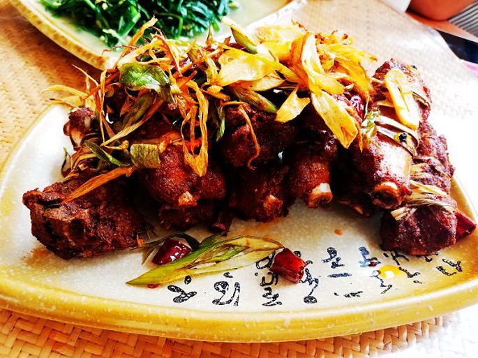 11:50到石月亮停车场,下车休息,远观石月亮。14:13到腊瓦朵(怒江第一哮),15:40到贡山县城(全称是贡山独龙族怒族自治县),在汽车客运中心旁边的“小董傣味园”吃午饭,傣族的香茅草排骨味道有些特别,很好吃。