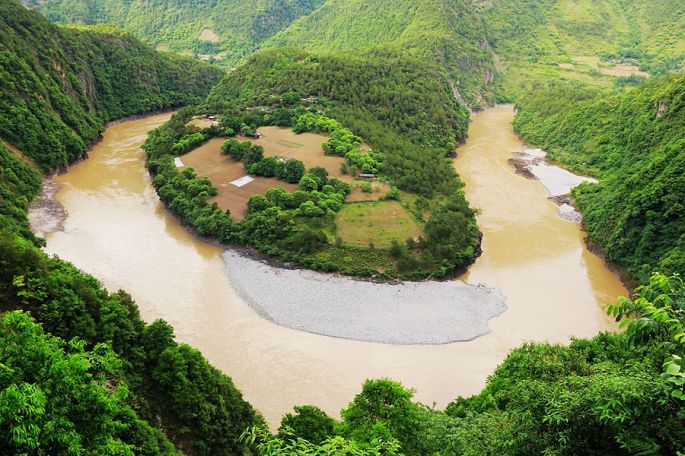 18:19到怒江第一湾,其实,类似这样的江河大湾景致,此前已见过不少了(如金沙江第一湾、龙江第一湾、黄河乾坤湾等),但这个怒江的第一湾还是有它的特色,尤其中间突出的那个山地部分,上面绿树掩映之中竟然还有农家房舍,有大片耕地,真像个遗世独立的桃花源,难怪它就叫桃花岛,而江中的水色现在是浑浊的,据说冬季时则是青色的。