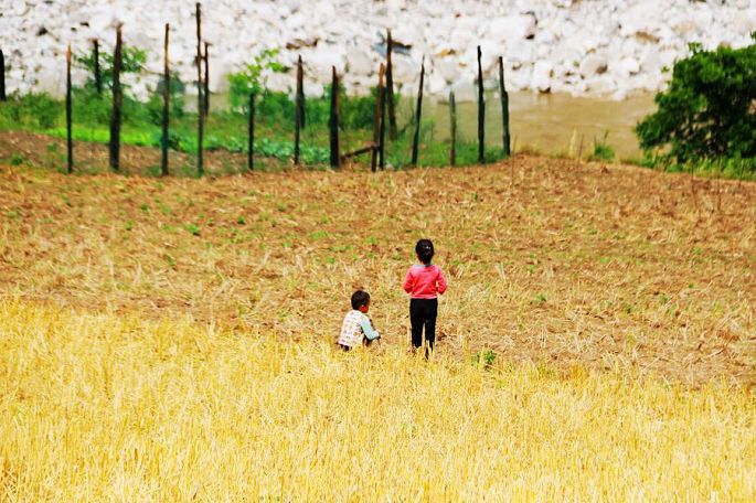 下车后先经过一座铁索大桥,然后沿正在施工中的一段木栈道,进入雾里村。初听雾里村的名字,感觉很诗意,充满各种想象,可惜今天阳光明媚,没有雨,没有雾,没有朦朦胧胧,不过,没有雨雾、并不朦胧的雾里村,感觉依然还是很美:小村坐落在青翠的大山之下,怒江河畔,村子不大,十几幢完全木结构的小屋星罗棋布般散布在山坡上,高高低低,参差错落,光秃秃的地里显然是刚刚收获过青稞,有小牛犊在地里静静吸吮着慈祥母牛的奶,同样悠然自得的,还有两个正在地里玩耍的小孩,他们不时地相互比划、交流着什么,又不时地向河对岸张望着……