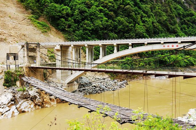 不走回头路,我们穿过村子,11:57从过去村里唯一的向外通道——古老的江边茶马古道走了出来,小黑正在这里新建的大桥桥头等着我们。三代大桥并列在这里(第一代大桥已完全废弃不用了),让我想起了去年在川藏线上通麦大桥见到的相似情形。