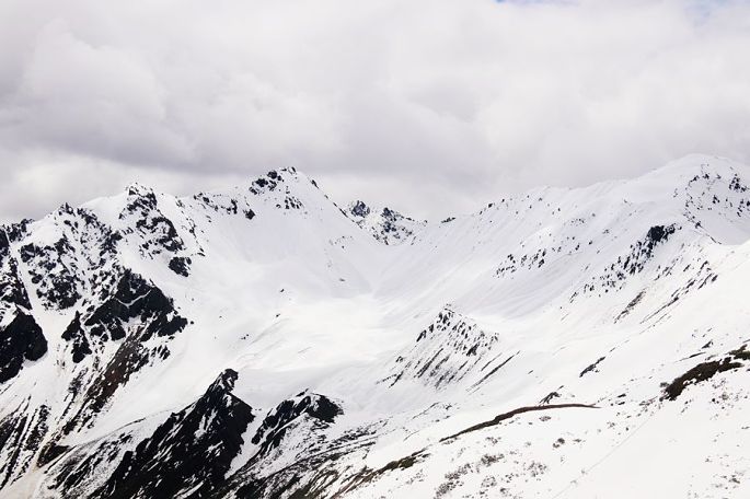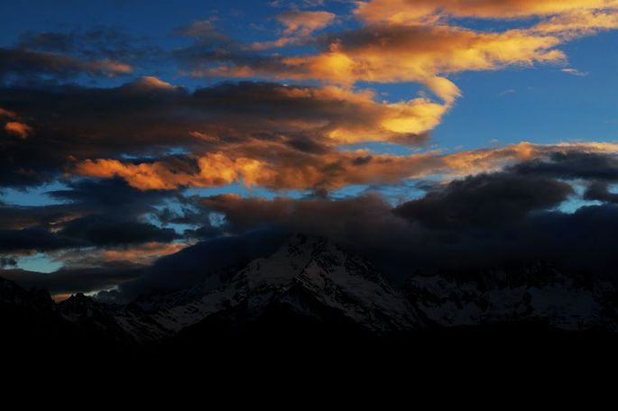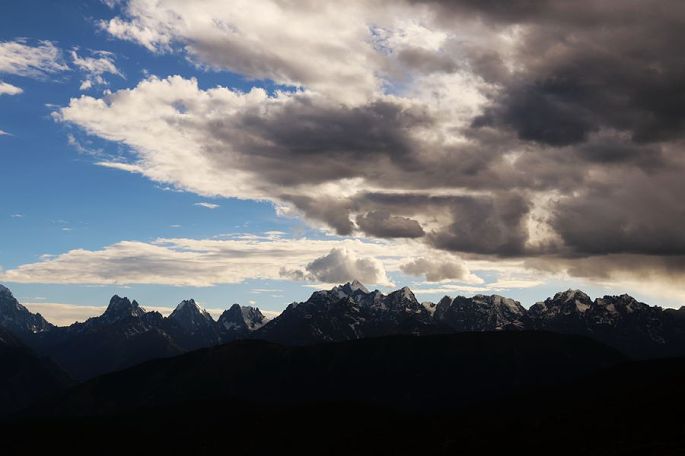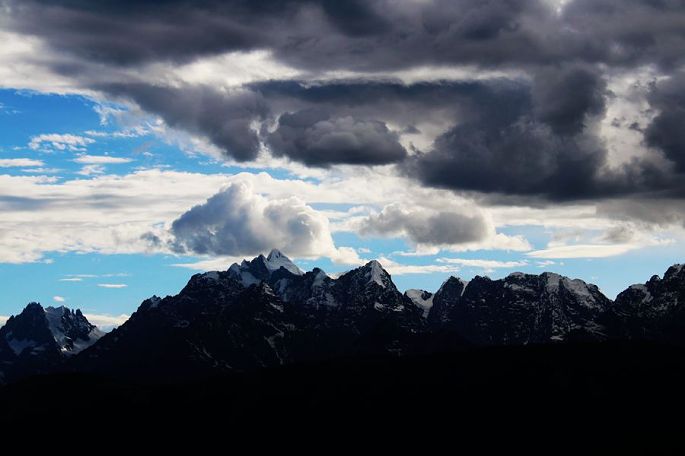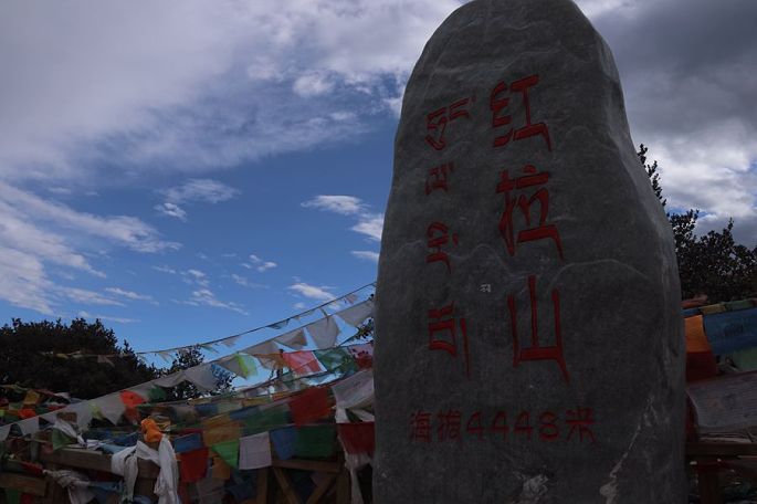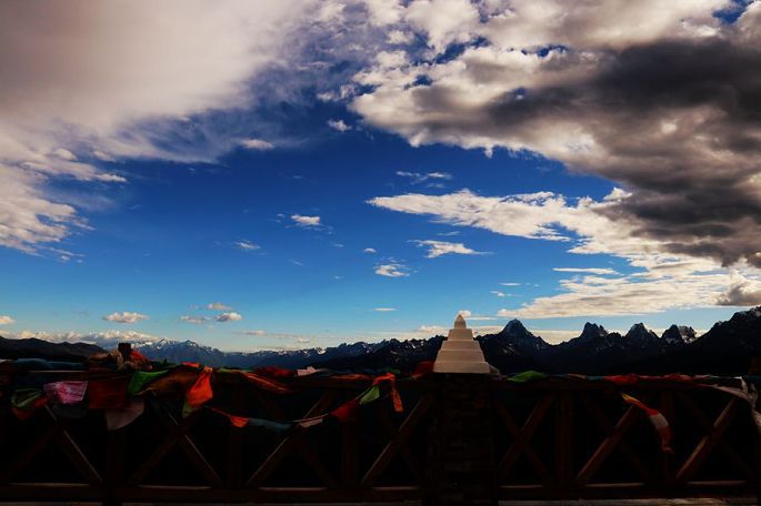 18:28到红拉山垭口(海拔4448米)时,已近黄昏,在观景台上眺望前方,雪山绵延,一座座高耸雪峰,历历可见,天空则乱云飞渡,磅薄汹涌,波诡云谲,景象非常震撼。