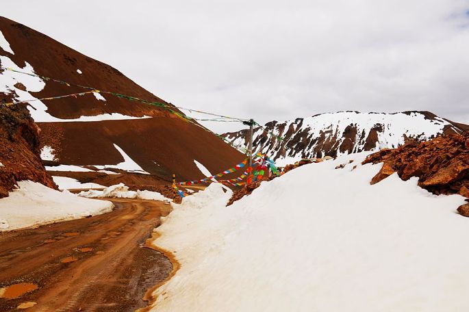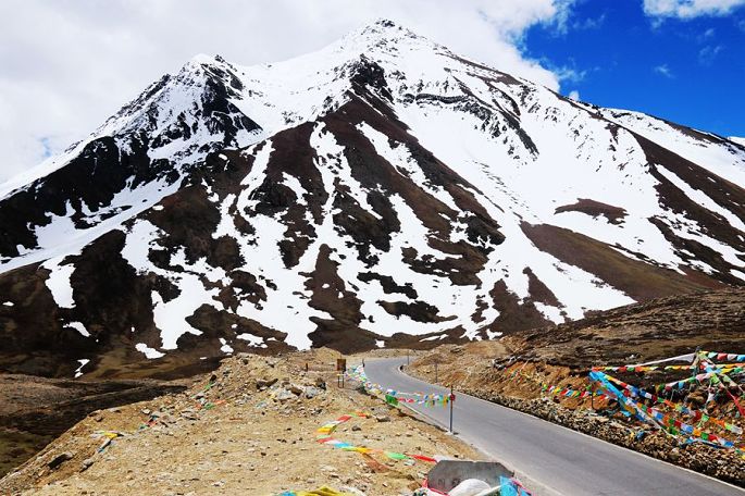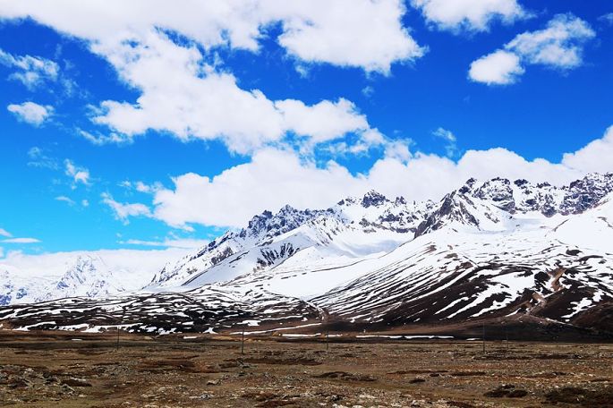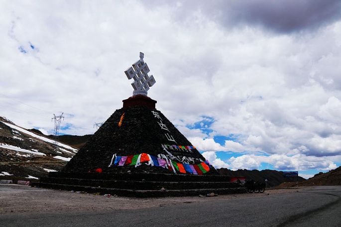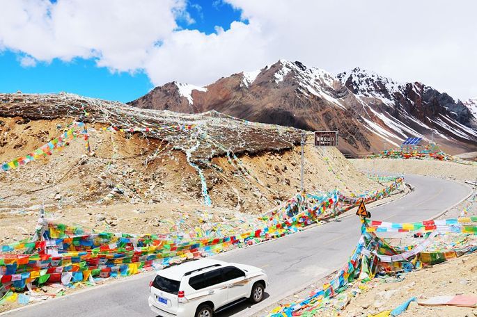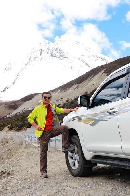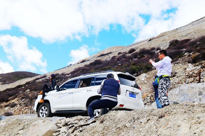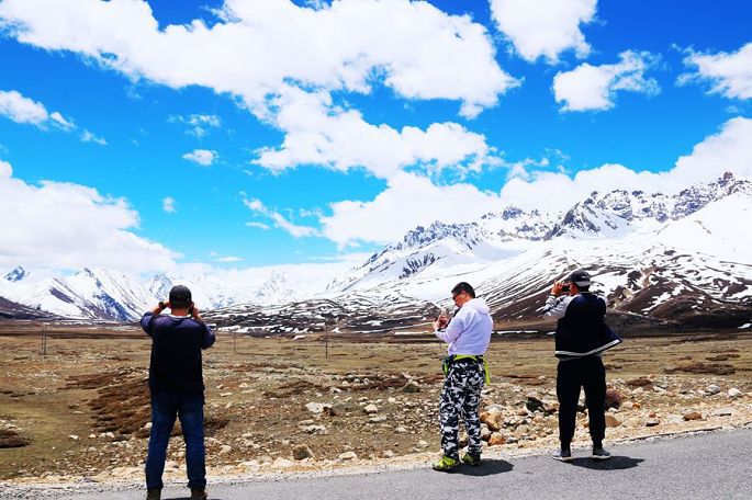 12:10到德姆拉雪山下,望着眼前巍峨的皑皑雪山,小伙伴们再次兴奋起来,各种姿势摆拍一番后继续上路,12:46过德姆拉垭口(海拔4900米),蓝天、白云、雪山,这是总也看不够的经典藏地风光,令人陶醉不已!同行的小伙伴小龙也情不自禁再次玩起了无人机的跟车航拍……